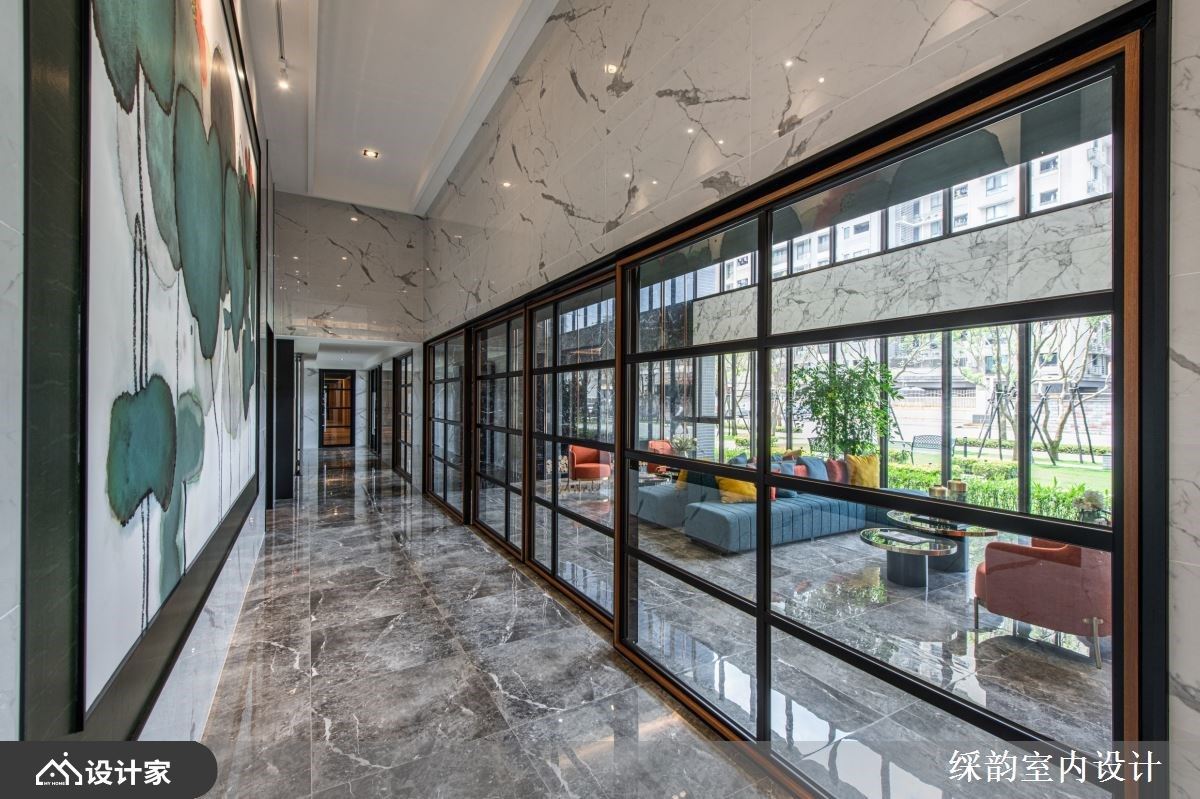 长廊上悬挂大幅中式画作,传递东方人文质韵,且以大面玻璃拉门设定,展现通透的空间感,且界定出不同的领域主题,随着挑高天花板与通透的材质安排,将户外的绿意、自然光接引入室,形塑开阔与不凡气度。