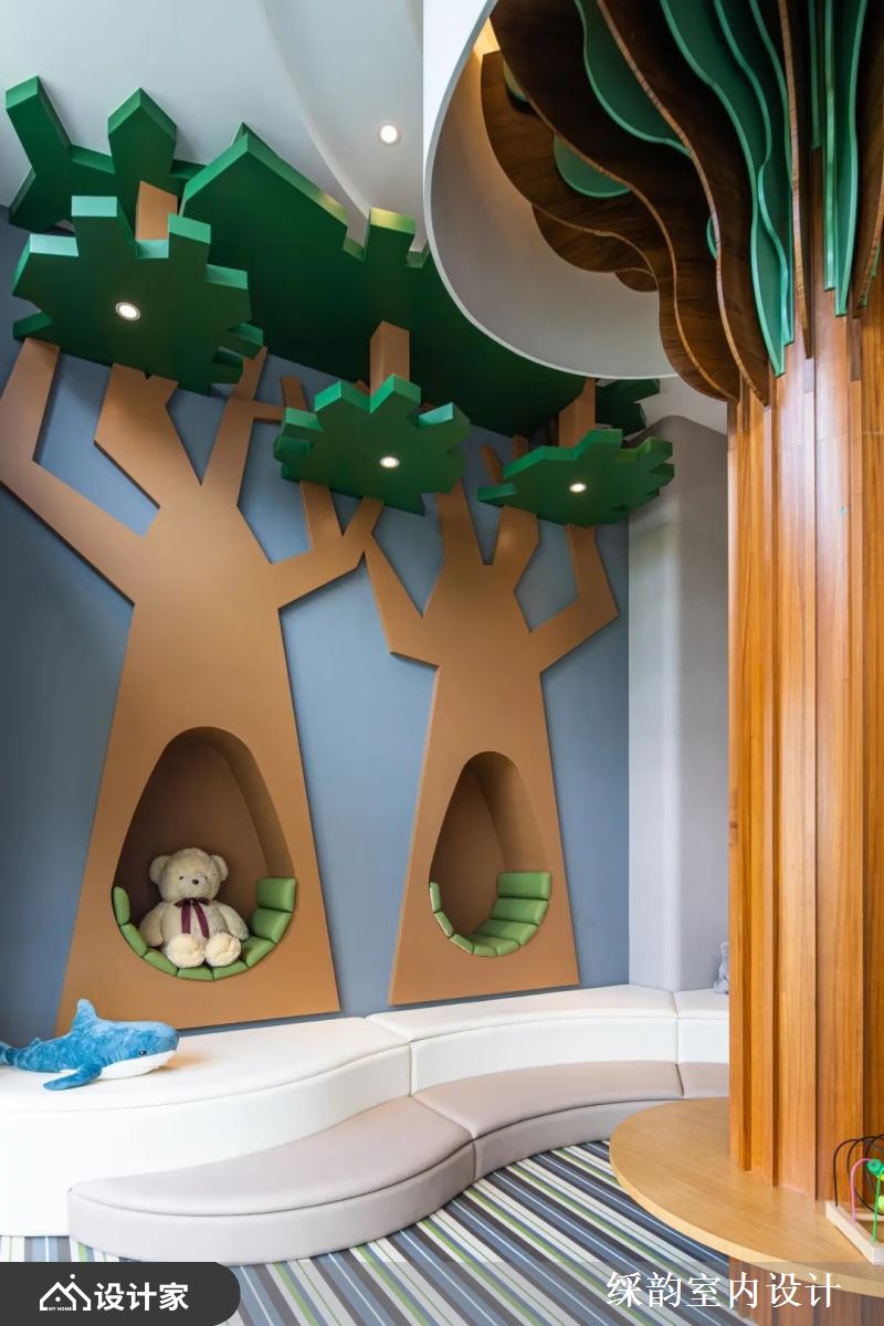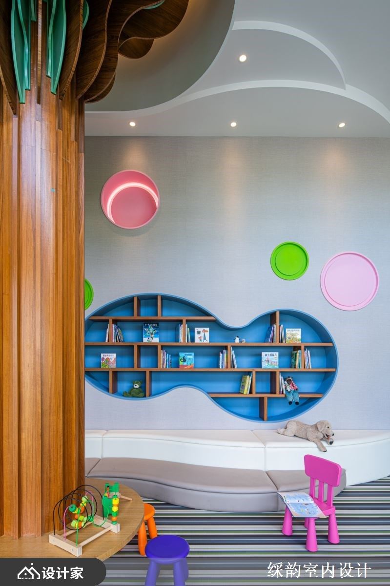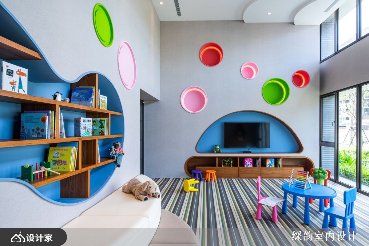 让自然走进生活里,利用森林里充满生命力的灵感,透过缤纷色彩与弧形等几合线条勾勒出实用机能,从电视墙、座位区到书墙。