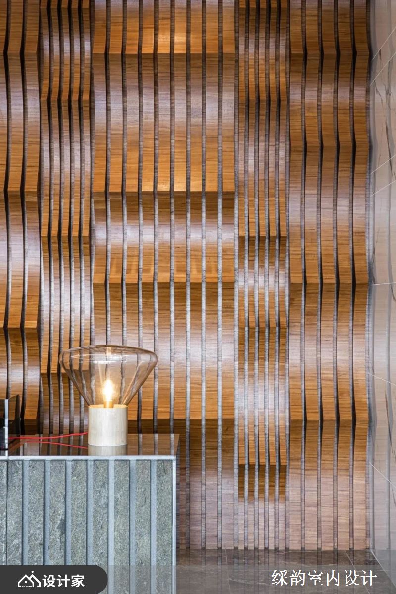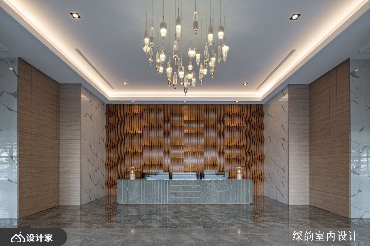 走进一楼大厅,渐层岩石肌理质感的大理石铺设地坪,天花板垂挂高低错落的剔透吊灯,带来一抹轻盈视感;原始质感的石材作为柜台,主题背墙搭以深色木纹安排,渐层木格栅造型以前后波浪般交错,伴随两侧以浅色石材搭衬,更彰显与烘托立面的震撼效果。
