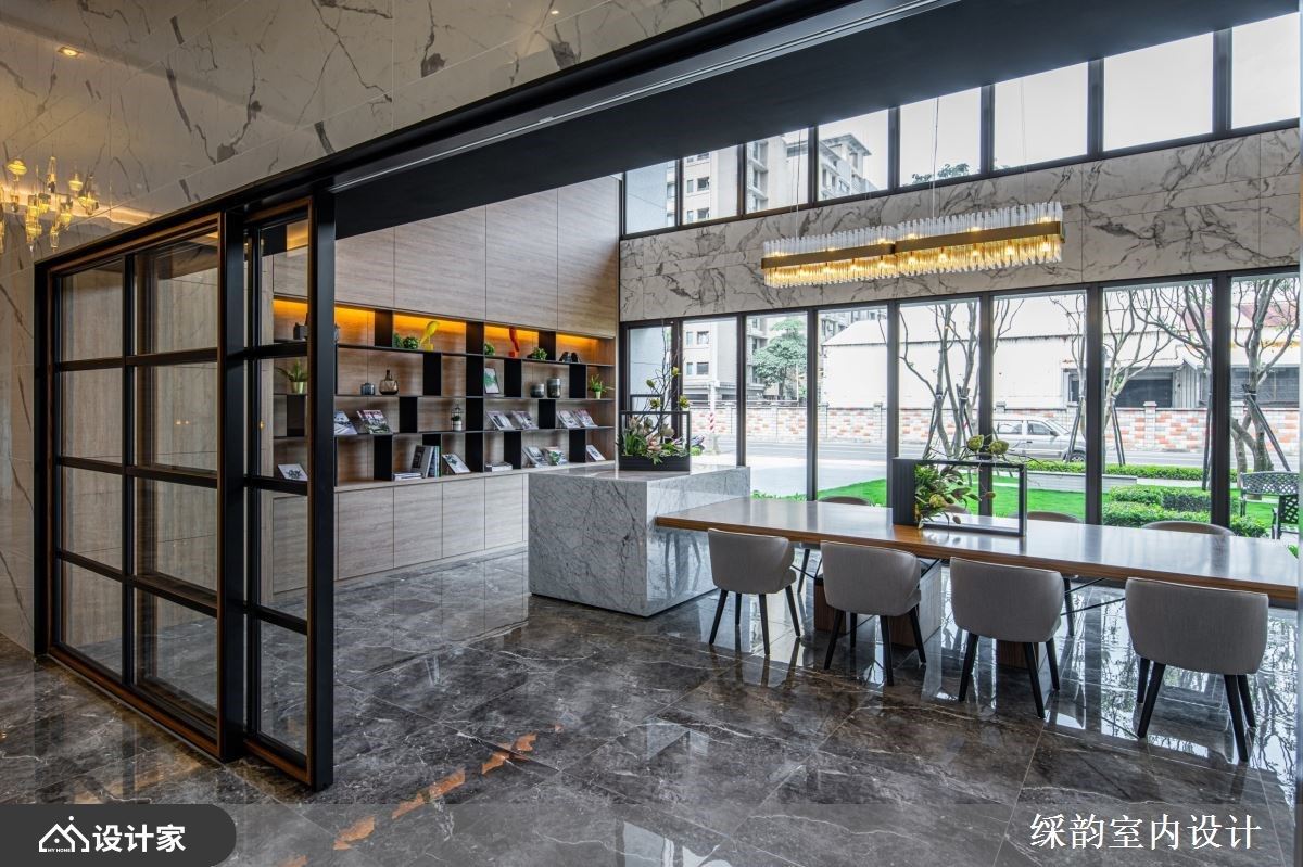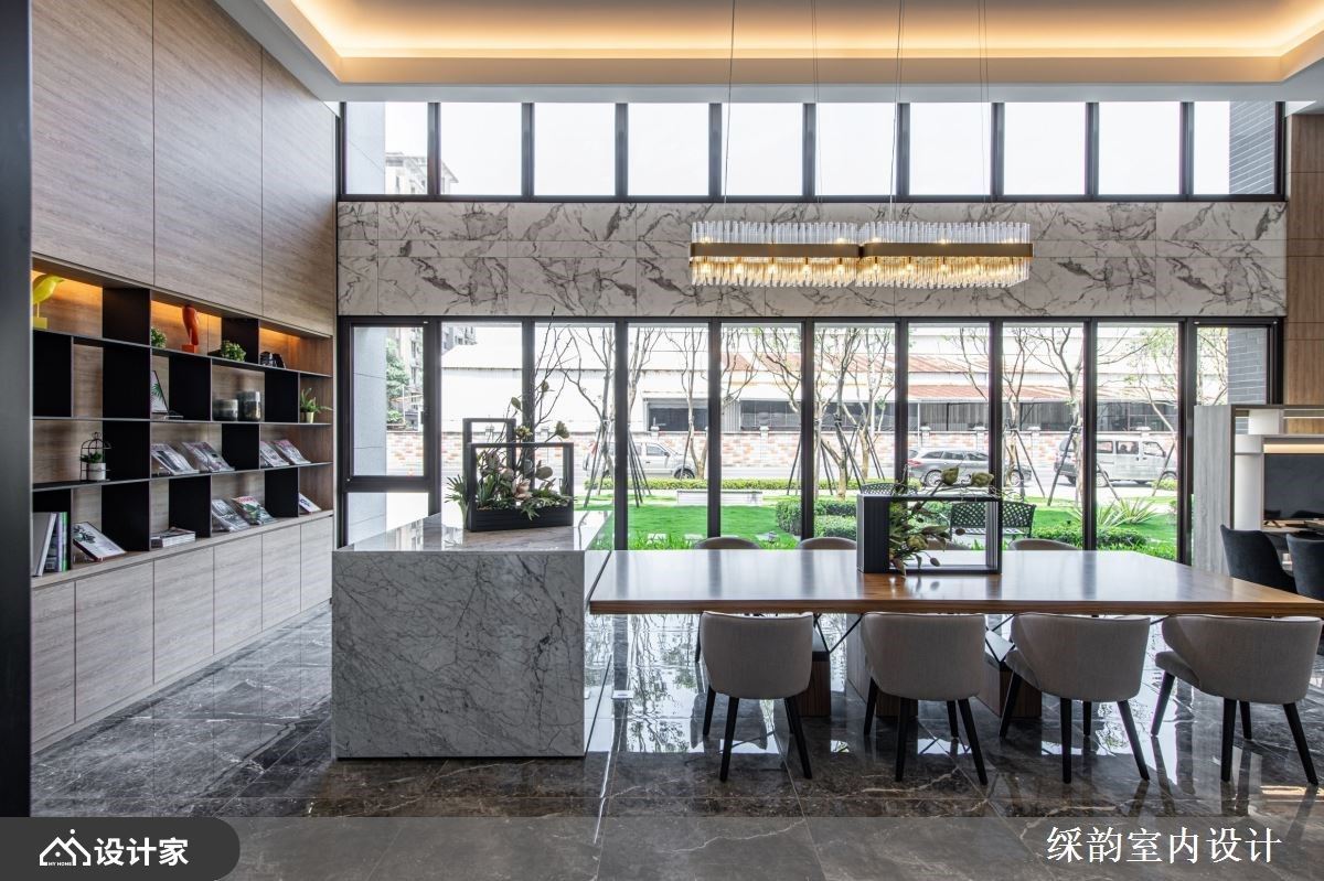 玻璃的建筑立面让户外绿意引援入室,伴随室内木纹与花艺安排,让人有沉浸在自然的惬意里。石材台面串连木纹长桌延伸出宽敞感,壁面以木纹衬底,铁件层板勾勒出展示空间,随着风格对象的陈列与替换,营造出人文美学气息。