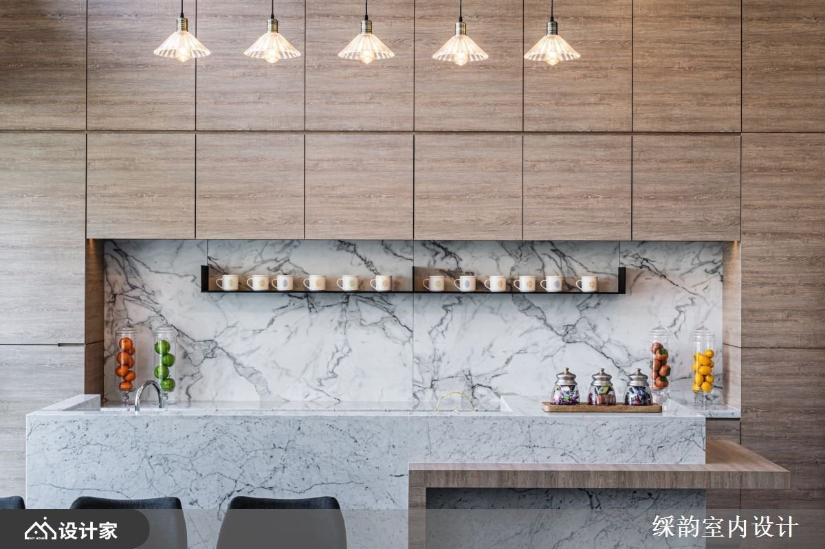 一旁的轻食料理区,木纹收纳柜体结合优雅纹理的石材作为墙壁风貌,石材衔接木作线条创造中岛吧台亮点,伴随壁面以细致铁件层板安排,独特的马可杯陈列其中,与设计感吊灯,擦亮视觉新意。