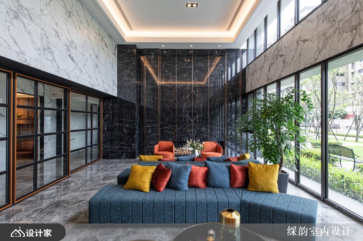 阅读空间里,延伸挑高天花板的非凡气度,透过间接照明与自然光,调和出柔和光感,中间以蓝色沙发并搭配跳色抱枕,丰盈视觉精彩度。深色石材墙体以镀钛条勾勒出奢华立面,对面书墙则以木纹衬底,利用嵌灯照明,调和出雅致、温润的气息。