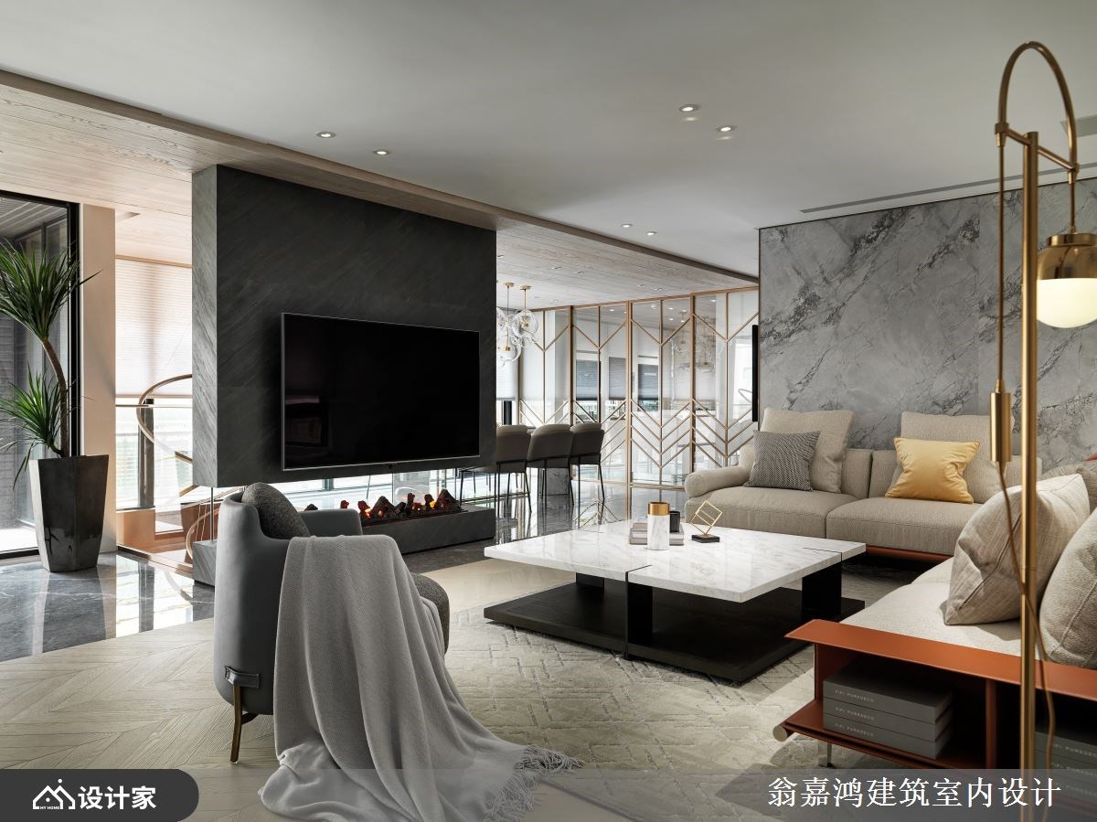 自地自建的独栋别墅的一楼规划为夫妻款待宾客用的招待会所,运用挑高优势设计,立面大理石延伸到天花板转为镀钛金属造型,创造现代大器的空间尺度。客厅休憩区除了大座沙发外,自然石皮堆叠出带点原始的电视主墙淡淡描绘出度假氛围;灯饰以玄关与餐厅大型水晶灯强调高贵质感;更订制智慧酒窖,凸显招待会所的极致品味。 二楼定位为私人起居空间,设计上以悬浮造型电视墙大幅提升楼层穿透感;电视墙下方设计壁炉带入温馨的异国情调。一旁的用餐区同样以大理石长桌搭配玻璃造型灯饰创造轻柔但质感绝佳的用餐氛围。造型玻璃拉门轻松划分中岛厨房,兼顾视觉通透与动线顺畅,又能有效阻绝油烟。空间除了客厅与餐厨,还特地规划了男女屋主公共享的多功能室,木格栅天花搭配木百叶创造出的人文风情让女主人能自在插花、男屋主专注写书法,在同个空间专注于自身兴趣。 三楼居室层以饭店总统套房作整体规划,采取三进式设计。外区规划开放式办公区,二进仿照温泉酒店来规划,将梳妆区、更衣间以及淋浴房都安排在床头墙后,保持睡眠区的单纯。贴心设计了茶水吧台,让喜爱品茗的夫妻在居士就能轻松喝茶谈天。 小编的最爱 餐厨空间订制大理石长餐桌容纳众多宾客,并与后方中岛吧台区做结合方便餐点备料;景观庭院以高低错落的植物造景,蓬勃绿意透过落地玻璃,替用餐氛围增添些许放松气氛。