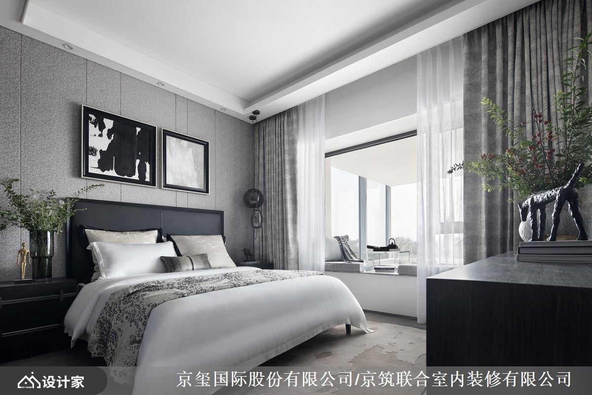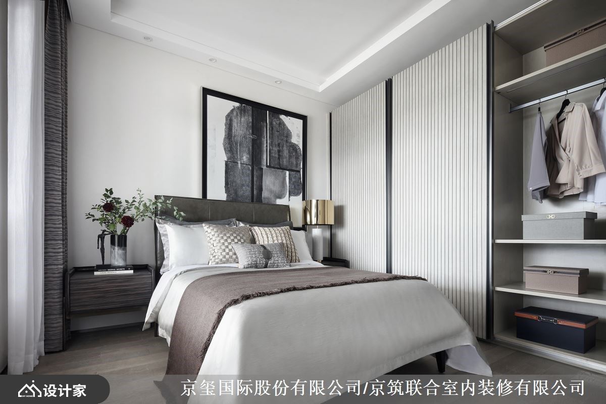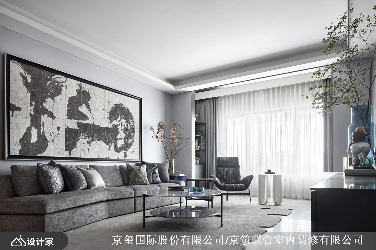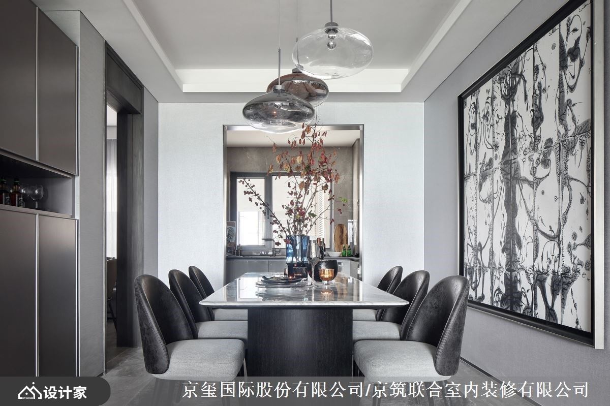 “艺术即生活,生活即艺术”。空间是设计师的画布,以黑白灰色调替空间打底,简约线性手法整合线条、各式材质、陈设软装巧思,串连起精致、独有的设计环节,揉合东方意象与当代艺术气息,构筑专属三代同堂的生活场域。 室内在一片内敛色调下展现静谧安定的内涵,自然光伴随落地窗走进室内,布满光影层次,让色彩、纹理与质地转化为富生命力的渐层律动。客厅电视墙铺上格栅风貌,搭配渐层大地色系柜体,上方摆设植物与风格逸品,传递人文思维的美学生活;沙发背墙则纳入水墨大景构图,隐喻东方雅致情怀,搭佐附上灰阶布艺的沙发与单椅,一旁佐入绽放的花艺姿态,加上擦亮视觉的金属立灯,替冷调的氛围注入柔软质地与自然生命力,交织出生活里亘存的温润气息。 餐桌结合对比的石材与木纹,布质与皮革包覆的餐椅,传递家的舒适与温度;墨艺浓淡深浅的演绎游走在地毯与壁面,随着笔触的起落与转折,书写各式生活节奏。 小编的最爱 东方水墨艺术持续挥洒且透过诗意语汇的轴线下,视线从公领域转移至私领域。睡眠区与更衣室藉由玻璃材质界定,通透的特性兼具机能与领域划分,且让视觉达延伸放大之效。