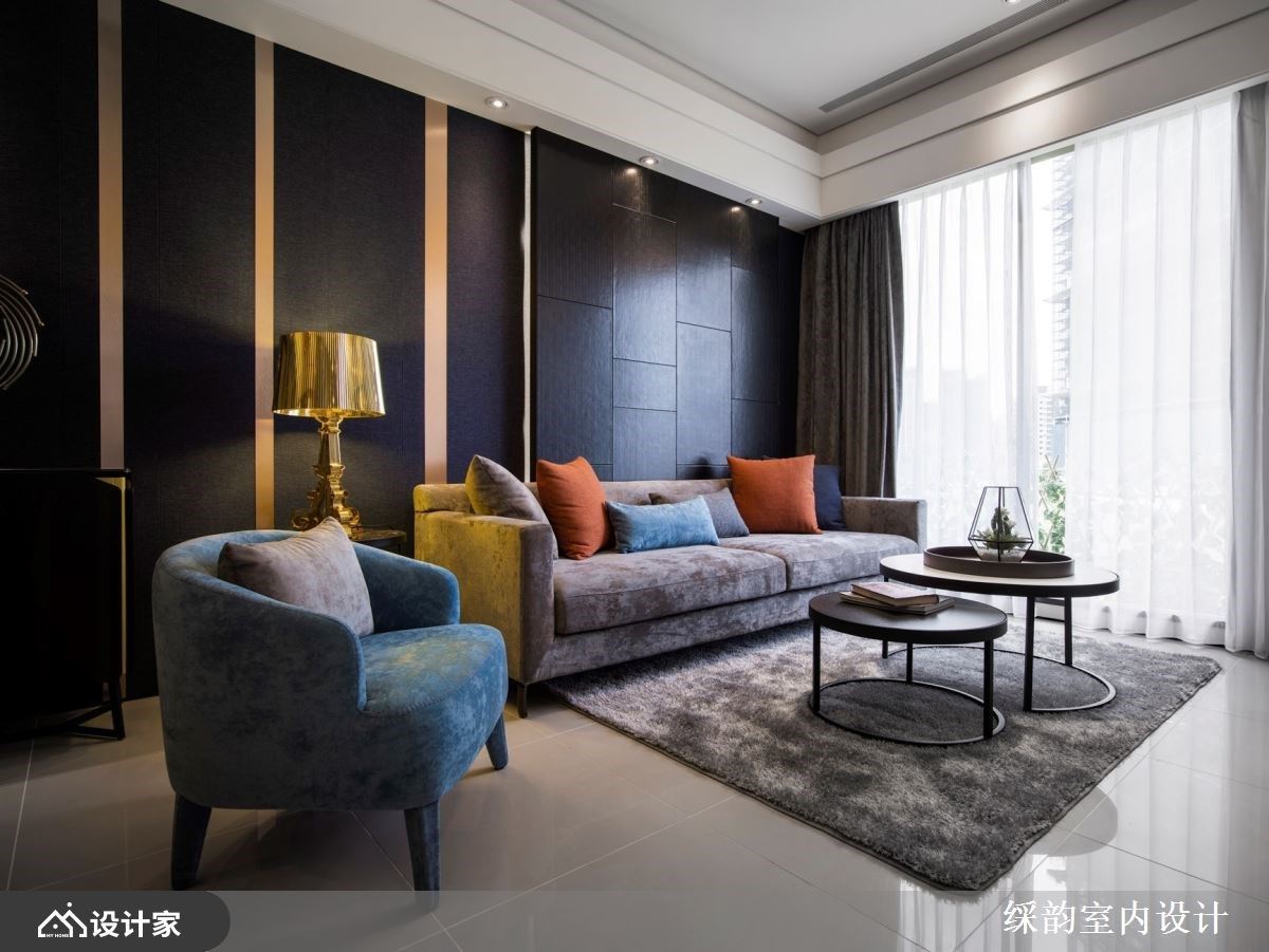 一整面深色的背景墙,在灰色沙发、跳色抱枕、金色台灯与细致艺术品的安排下,擦亮视觉新意,流露出时髦、活泼的空间感受。