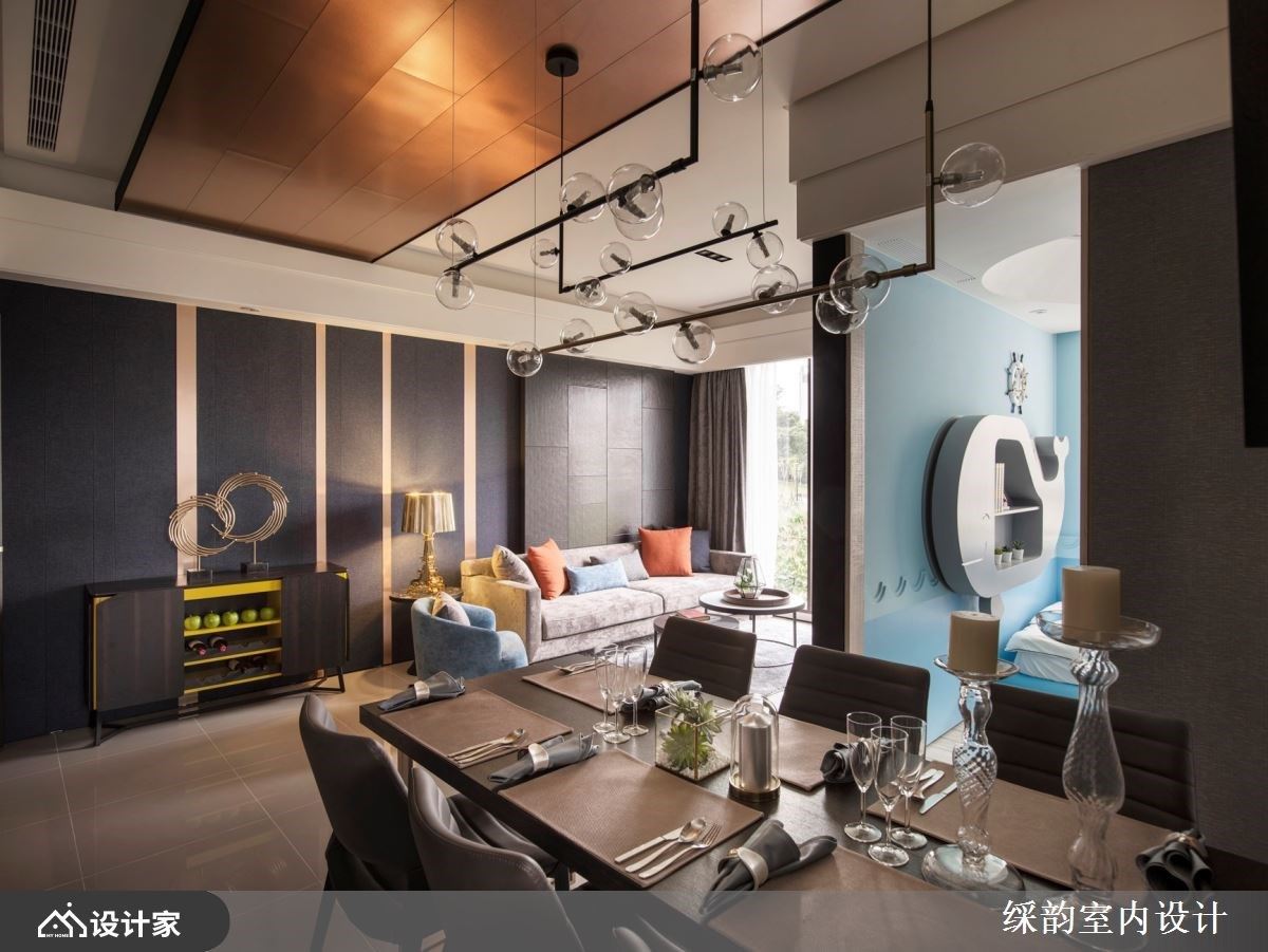 天花板以一道镀钛为基底的长形区块延伸至餐厅区,新颖的视觉感替空间挹注一抹时尚风采;餐桌挑选深色木纹材质,多了份沉静气息,天花板饰以玻璃泡泡质感的造型吊灯,壁面挂上活泼的亮黄色画作,倾注人文艺术之美。