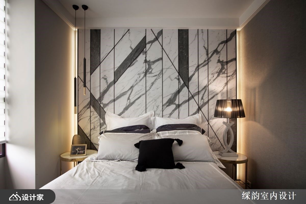 主卧以简约现代感为核心,挑选灰、白色系石材,利用几合、斜切割造型拼接床头墙造型,描绘出灵活多变的视觉感,背面再搭佐间接照明,以及侧边悬挂渐层的金属灯饰与台灯,藉由光影变化与揉合细腻材质,丰盈视觉美学层次。 浅色木纹的展示收纳墙与梳妆台注入雅致的气息,圆型镜面的安排更增添东方人文之美。