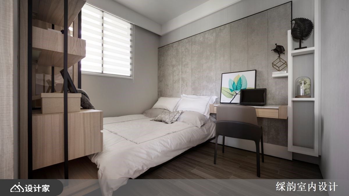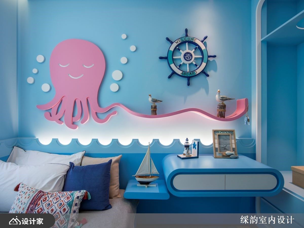 次卧空间以朴实的灰色为基底,藉由收纳层架的设计,营造出简约生活质感。小孩房则以海洋为灵感设计,船桨与章鱼成为主题墙,串连书桌与睡眠区;床尾墙面则是利用鲸鱼的身体作为展示空间,交织出充满想象的童趣日常。