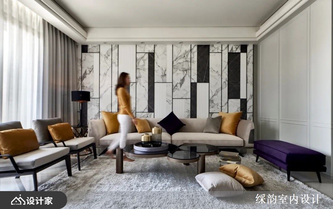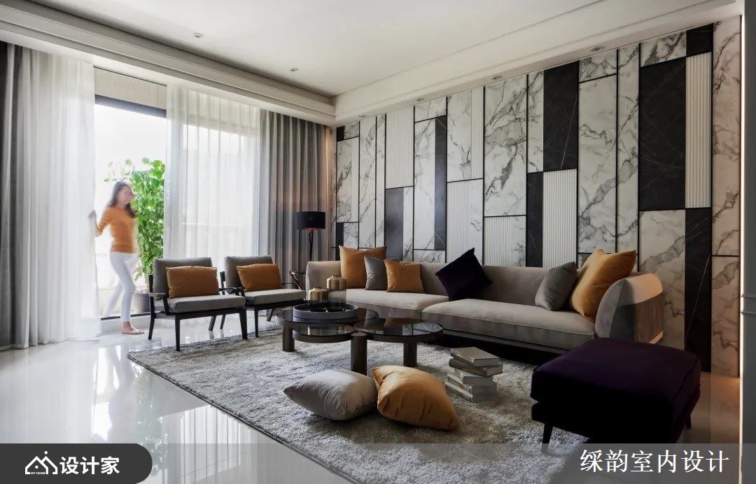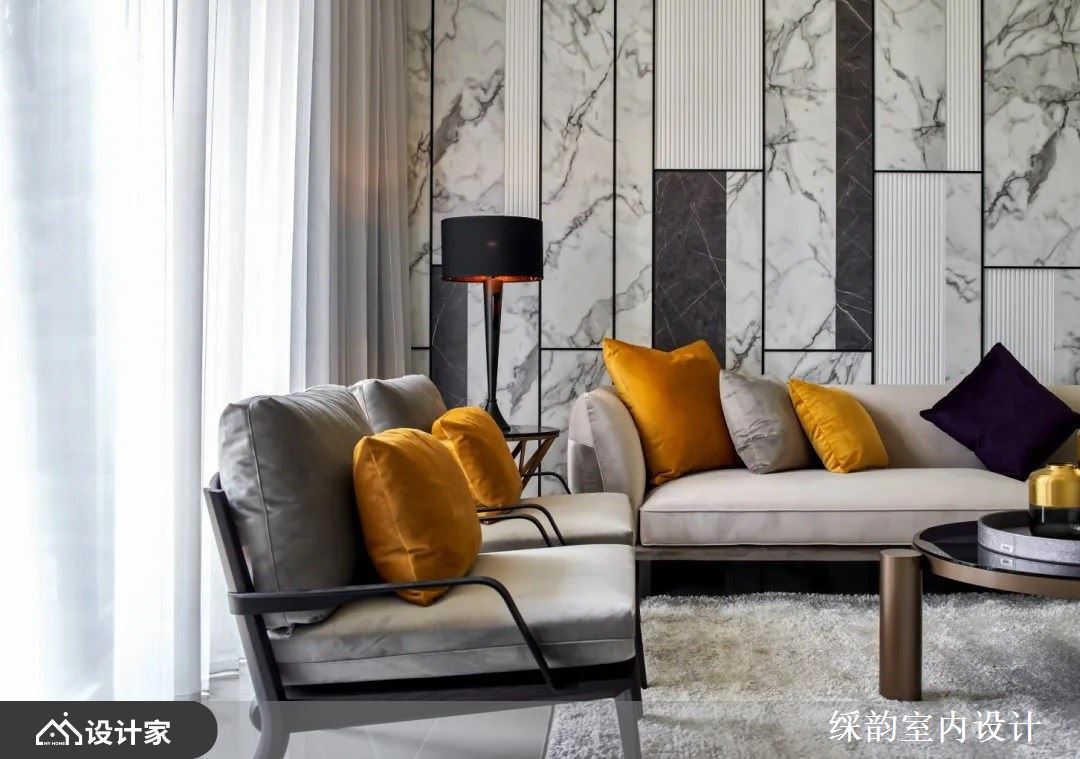 沙发背墙挑选白、灰、黑三色为基础,直立线条与淡雅纹理拼接其中,创造出蕴含视觉层次的风格造型墙;沙发搭配单椅创造出家人凝聚的场域,芥末黄跳色抱枕的点缀,营造出活泼、明亮的空间氛围。