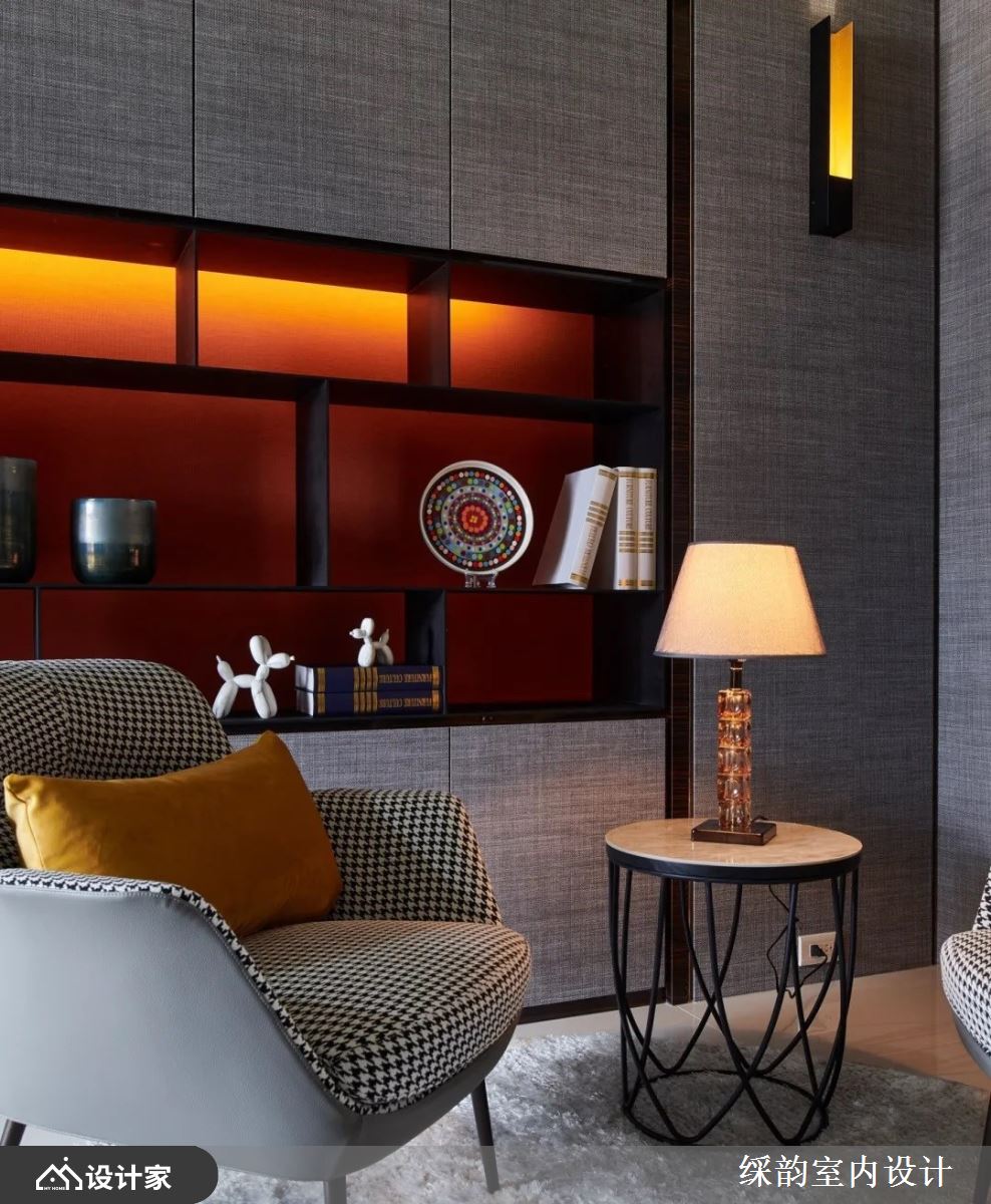 进入居室里,先来到经典风格的阅读空间,利用深灰布艺质感墙纸铺陈壁面,铁件层架打破一陈不变的柜体造型,中央区块的展示空间让屋主的收藏品得以尽情展演。