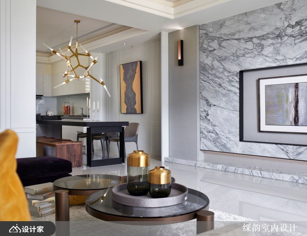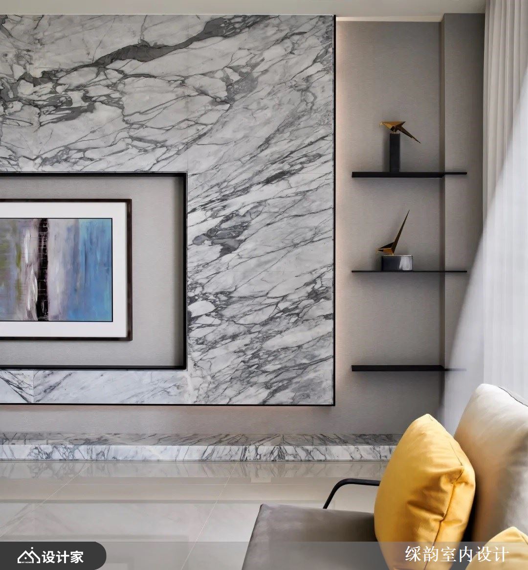 客厅里,敞朗日光随着落地窗走进室内,照亮空间的动人细节。电视墙以石材造型衬底,灰阶文理的横向描绘,交织出大器风采;透过框景造型的渐层堆栈,营造出画框般的诗意气息与人文意境。
