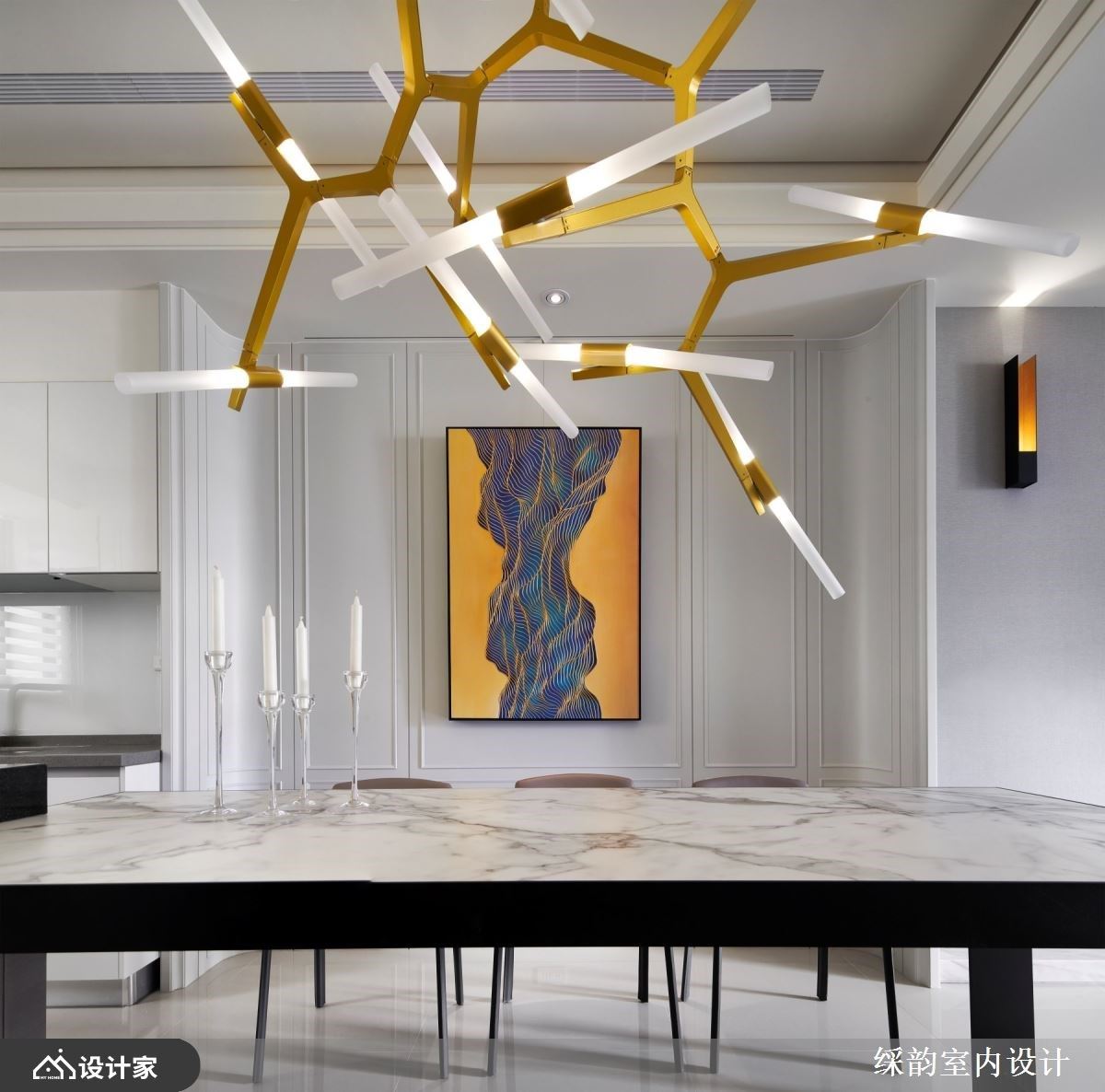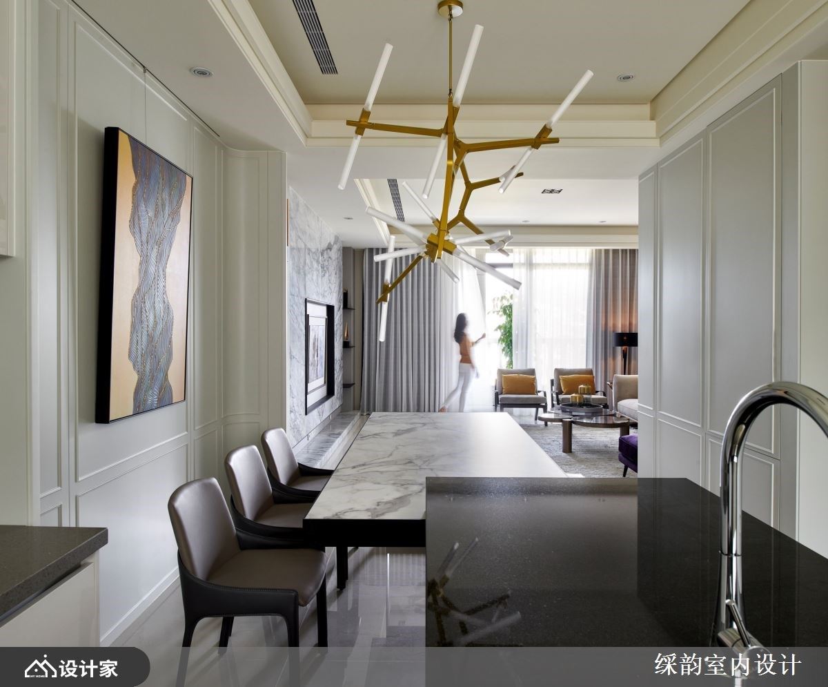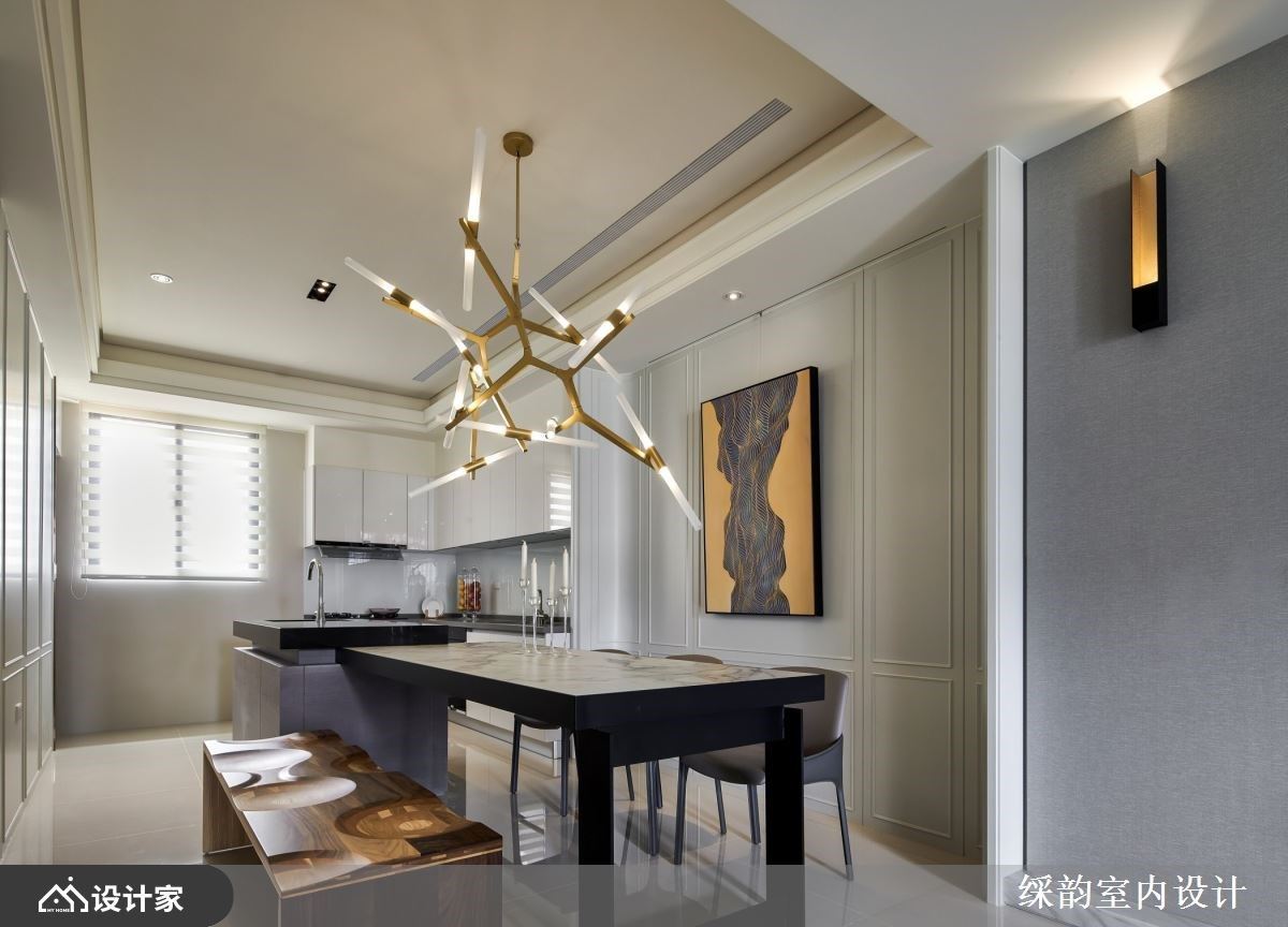 餐桌串连中岛吧台,拉出两侧日常动线,靠近餐桌的墙面,以两侧弧型包覆、线板描绘出优雅质韵,挂上一幅线条感的视觉画作,伴随树枝感的造型吊灯,创造出人文美学风采的美食飨宴。