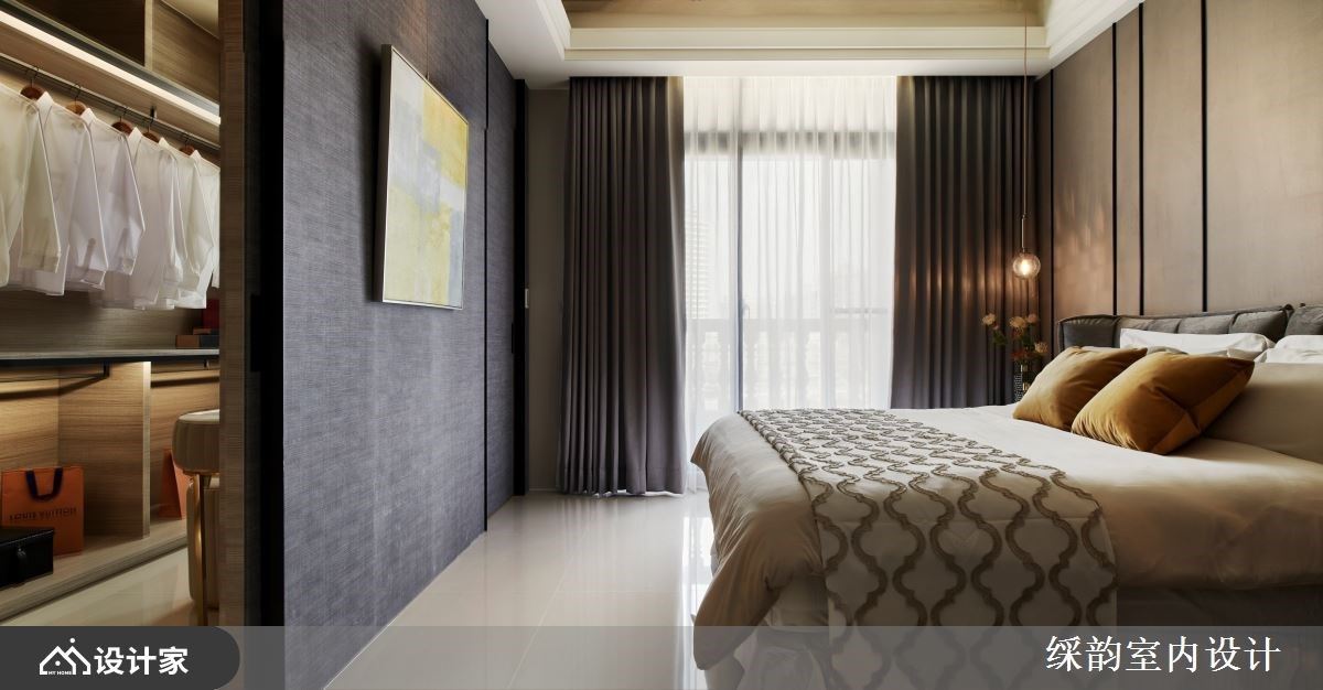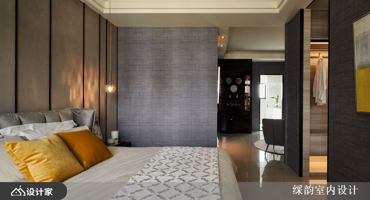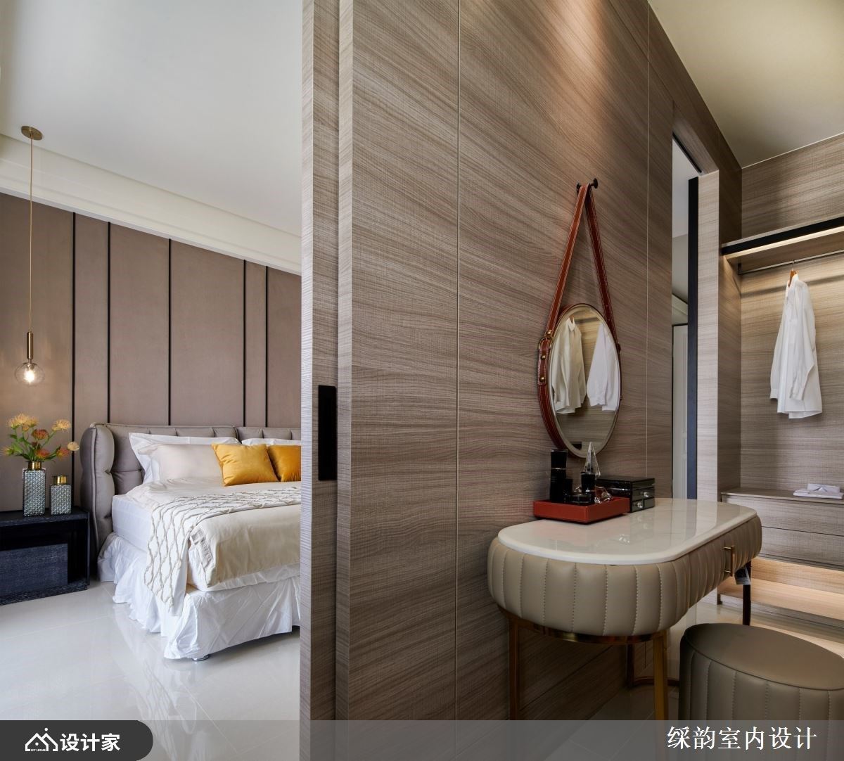 床头以大地色系安排,搭佐对称玻璃质感吊灯,伴随光影洒落壁面,营造出静谧、精致的休憩氛围;床尾两侧以拉门划分独立更衣室,大量的木纹质感为场域基底,挑选米色皮革造型的梳妆台与椅子,交织出温润的梳妆环境。