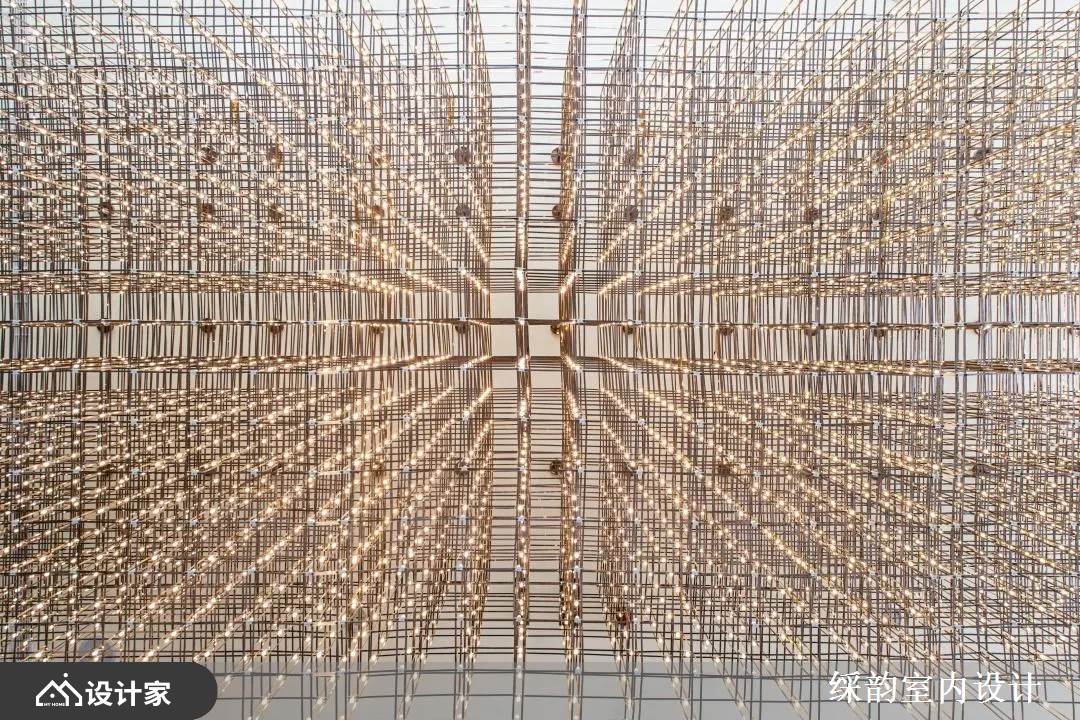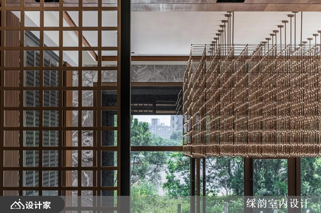 柜台后方衬以深色窗花般的造型,伴随两侧深木纹格栅立面,与浅色石材拉出色系与冷暖质感对比,交织出渐层美感;天花板藉由镀钛贯穿灯泡,交织出放射状、精致感的造型天花,当夜晚来临,彷佛沉浸在布满繁星的自然里,替空间增添细致光泽与时尚感。