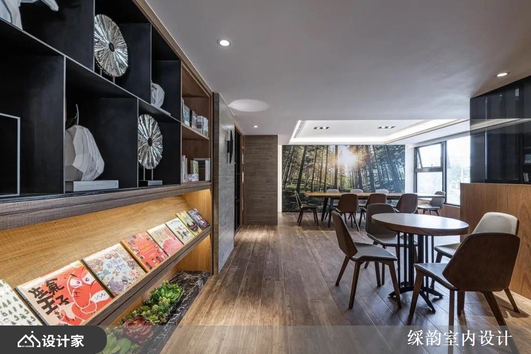 沿着石磨色泽的阶梯走上楼,木纹铺陈满室地坪,且伴随墙上以森林里阳光普照的主题画作,让人彷佛走进大自然里,墙面藉由铁件与木纹创造出陈列艺术品、书籍的展示区,丰盈空间的表情且赋予人文艺术之美。