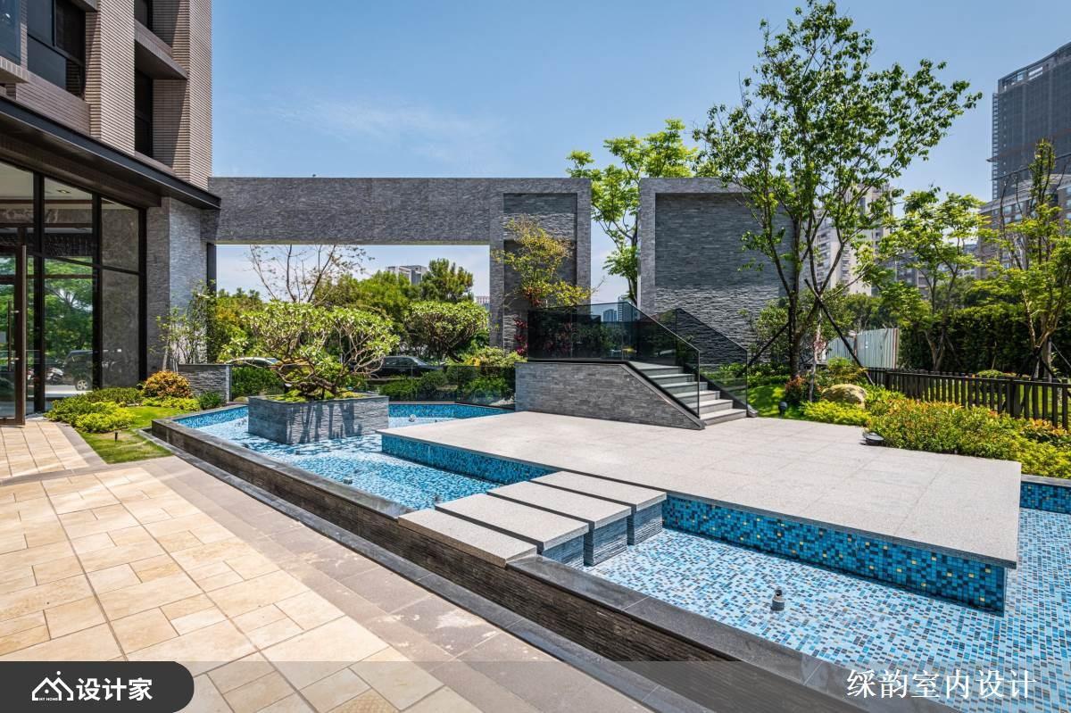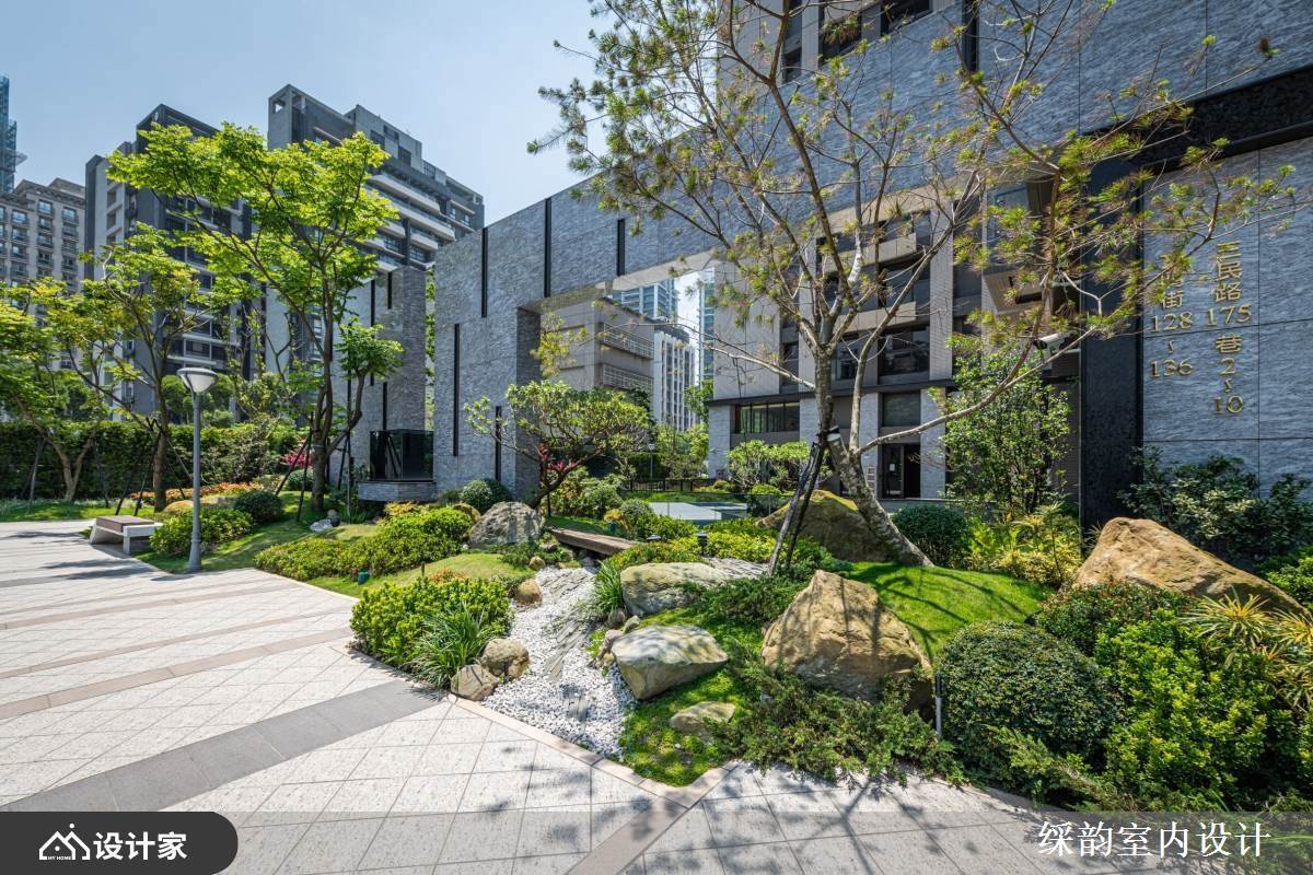 建筑的入口以小桥、人造石与树林为题,衬以壮阔石材的建筑背景,交织出原始与现代交错的美意。而一楼的户外持续蔓延绿意景致,且打造人工池水,呼应小桥流水的诗意,营造出沉静写意的生活态度。室内则透过大面窗户,将自然造景引入室内,室内外呼应,景情相融,诠释出与自然共生共存的深意。