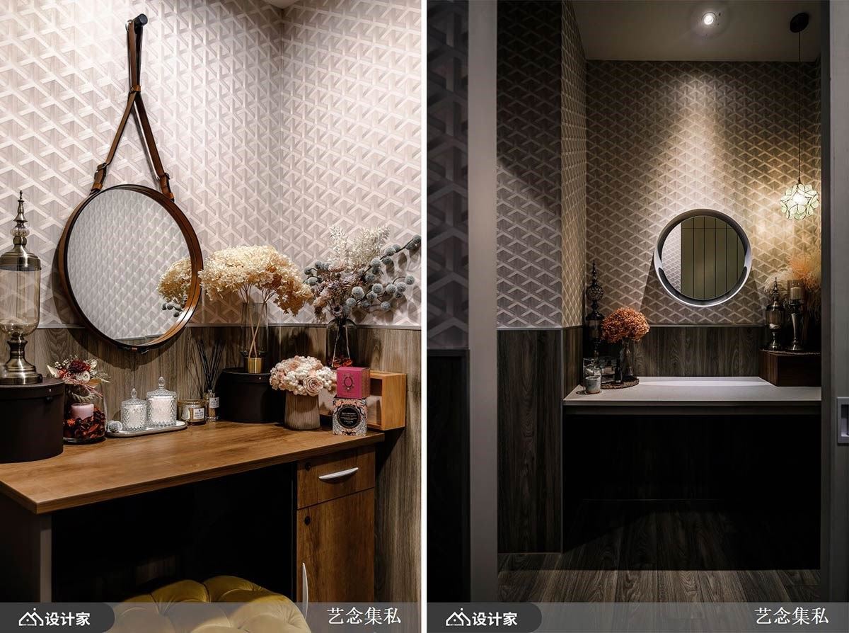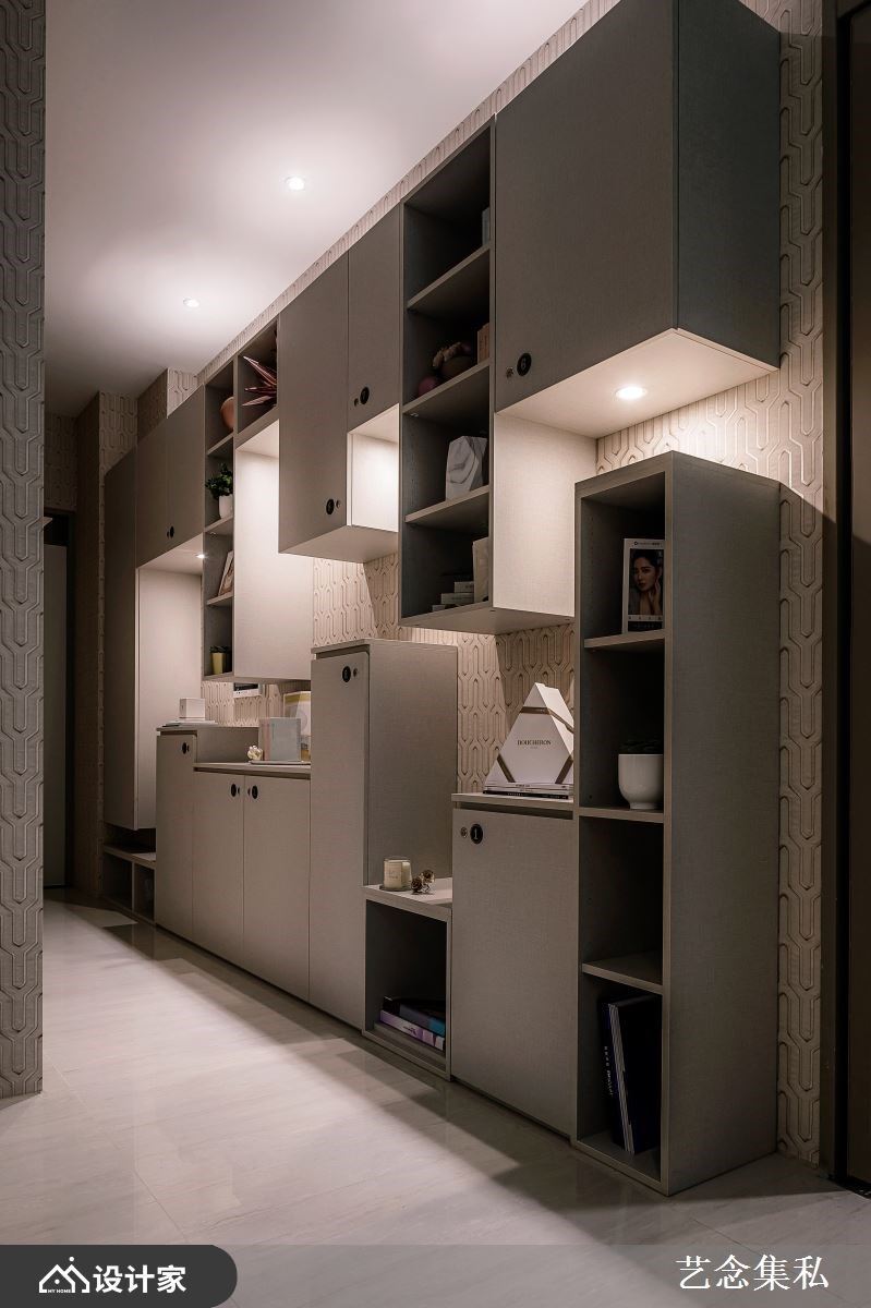 前往二楼的廊道安排四间谘询室,利用一楼挑高优势将用窄长的拱形门时戴传统门片,在视觉上加入更多吸引女性的线条;内部诊间同样以沙发座位营造放松分为、并利用布幔补足隐私性。针对女性最常使用的化妆台与卫浴空间,因没有沐浴水气问题,故选用超耐磨地板去处理地材与腰板,让使用者感受到更贴近居家生活环境的设计、也加速施工速度。面对容易破坏空间美感的收纳系统,设计师选择将收纳柜安排在动线上,利用廊道宽以系统板材打造深度40cm的复合式收纳柜,将精品橱窗概念与收纳机能结合,跳脱让人有压力的匠气设计,体现自然实用的美学设计。