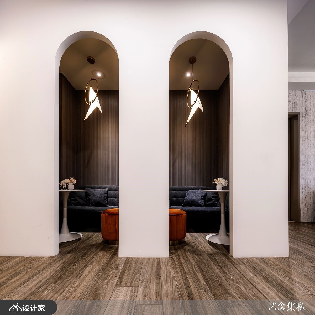 有别于一般医美诊所大量使用玻璃、磁砖等反光材质以及亮白的色调,赋真妍皮肤专科诊所从女性角度出发,空间定调上以建立“质量”、“美感”与“信任感”为设计核心。从毛胚屋开始规划,百坪大的复式楼运用木皮、石皮、壁纸与布幔等柔性材质创造出让人安心的空间气氛;软件陈列精品抱枕,搭配小鸟造型的设计灯饰等等,营造出奢华高端的空间美感,让顾客进来就能感受到空间带来的美学氛围,而摆放的沙发与抱枕、可以拍照打卡的网美墙以及舒适静谧的谘询诊间,让进来的顾客能感受到自己在生理与心理都能调整到更好的状态。