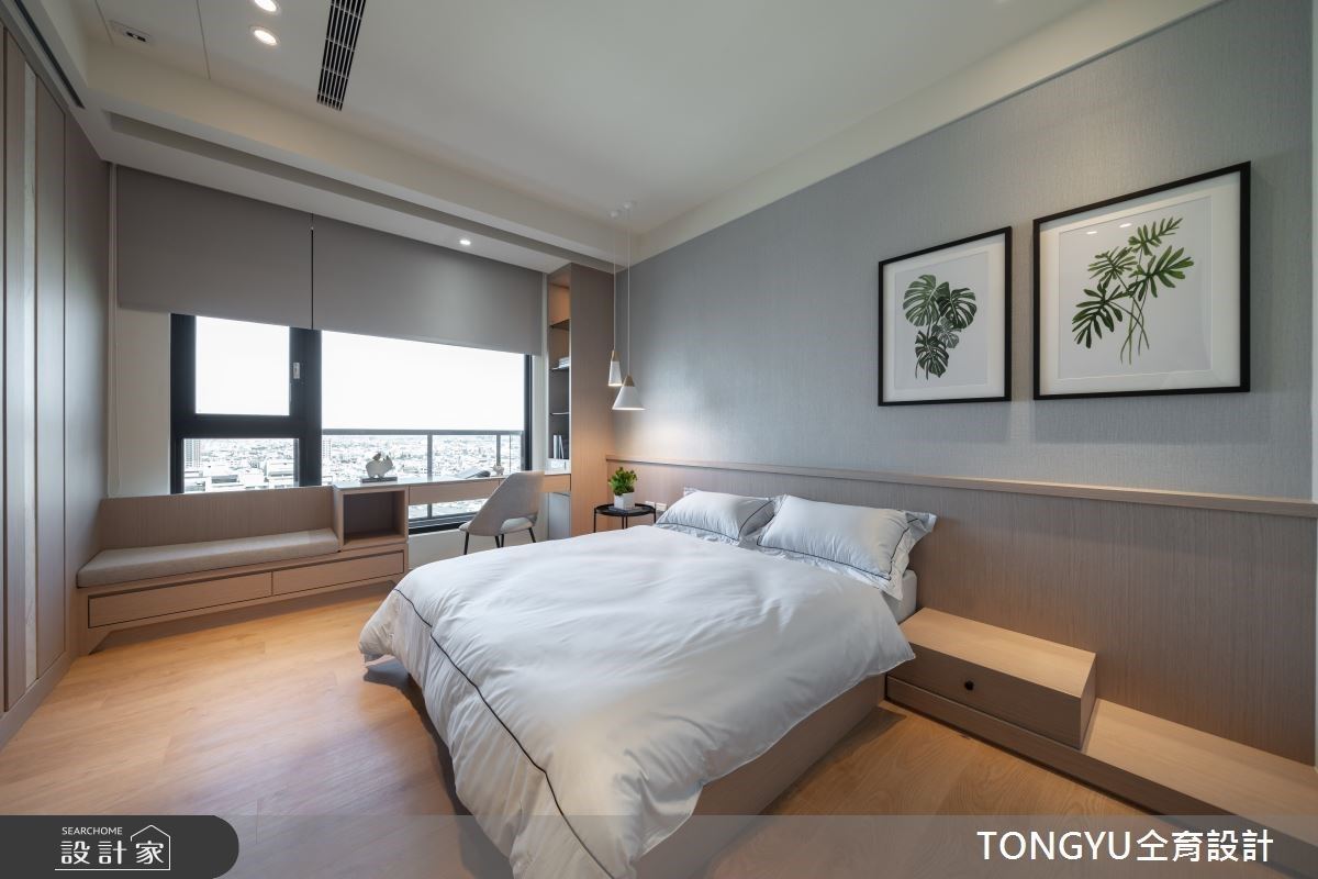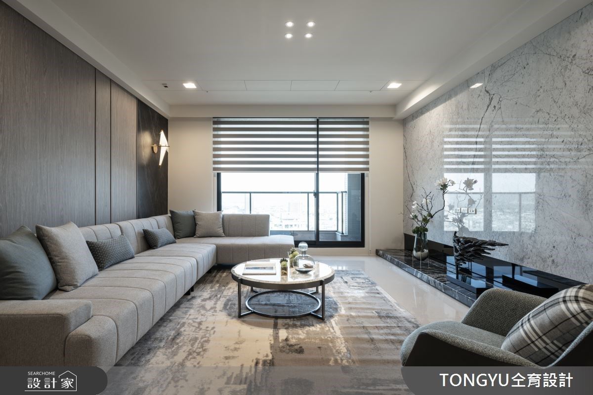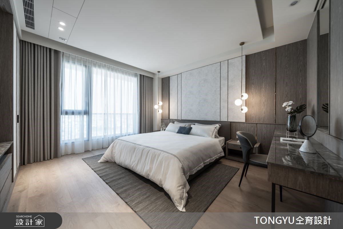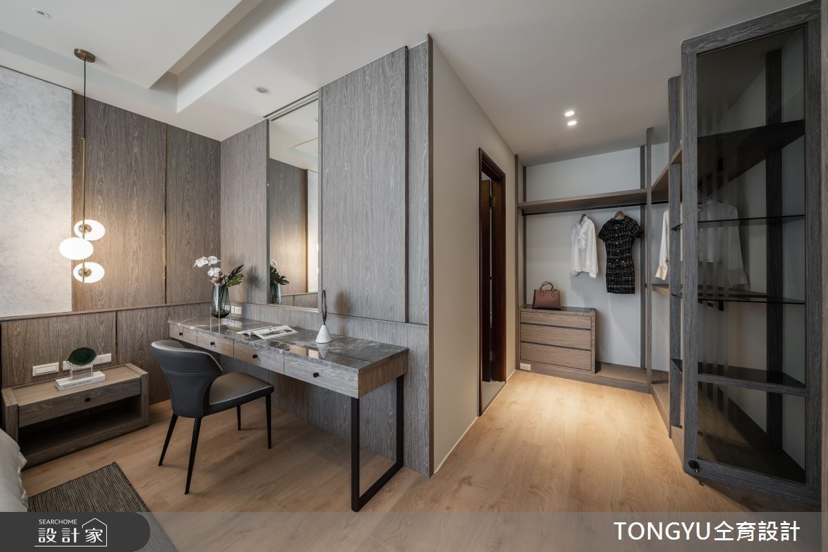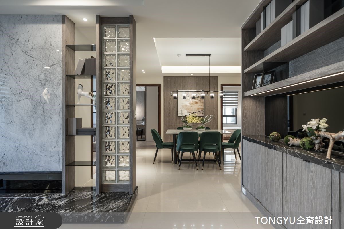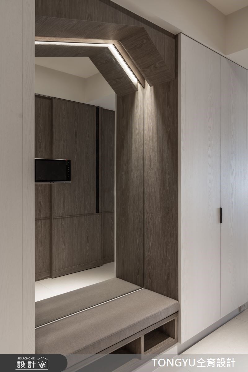 74坪浅灰调现代风宅内,天然石纹与木质元素交织宁静氛围,以低彩度的建材打造温馨舒适的3房2厅居宅,仝育设计 庄媛婷、郑瑞文设计师,在场域机能与空间氛围内找到最合适的呈现模样,让屋主尽享慢活日常内的美好细腻。 入门玄关的机能常为空间设计上的重点,将穿鞋椅、整装镜、收纳空间整合于壁面,运用柜体深度打造方便坐卧的穿鞋椅,上方的不规则木作造型内嵌灯源,有效提升外出时的便利性。 考虑到客餐厅场域的区隔性与私领域的隐密感,透过电视墙结合玻璃砖与镂空展示架的设计,打造若隐若现的穿透感,餐厨空间则作为居宅的中心点,将家人情感圈在欢聚的用餐时刻。 主卧空间结合更衣间与化妆台机能,次卧则结合书桌与飘窗,私领域不仅延续公共空间的轻柔色系,更加入复合式机能,打造宁静安寝的睡眠场域。