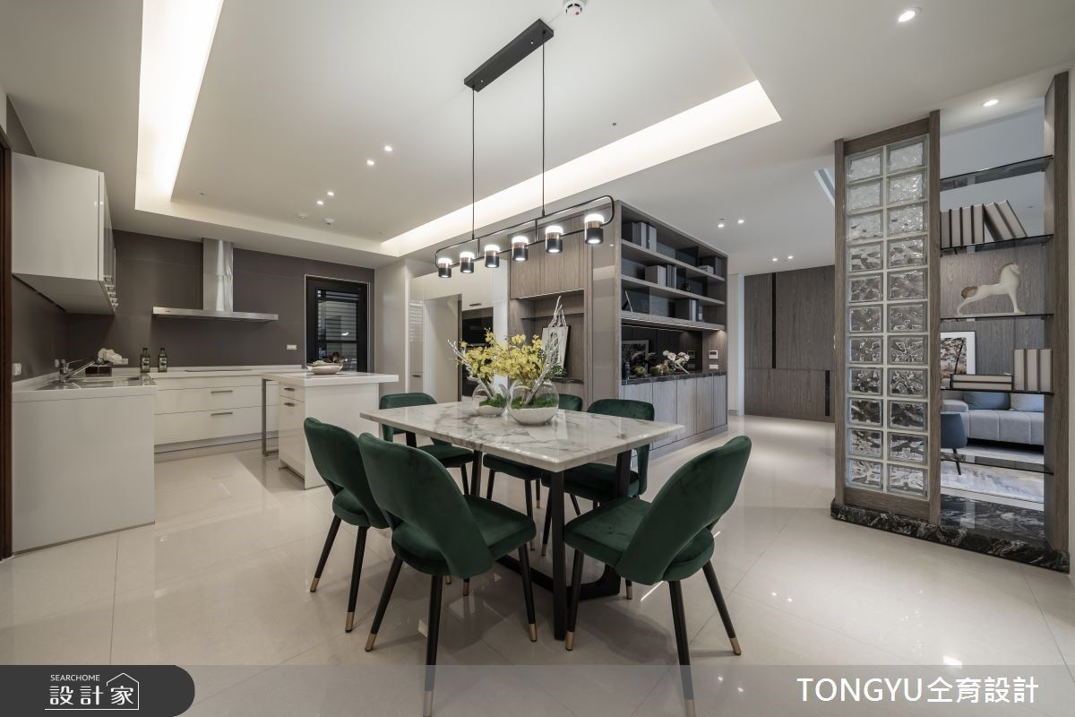 衔接公私领域的餐厅则选用深绿色餐椅,作为视觉上的吸睛亮点,让浅灰调现代宅有更鲜活的呈现样貌。