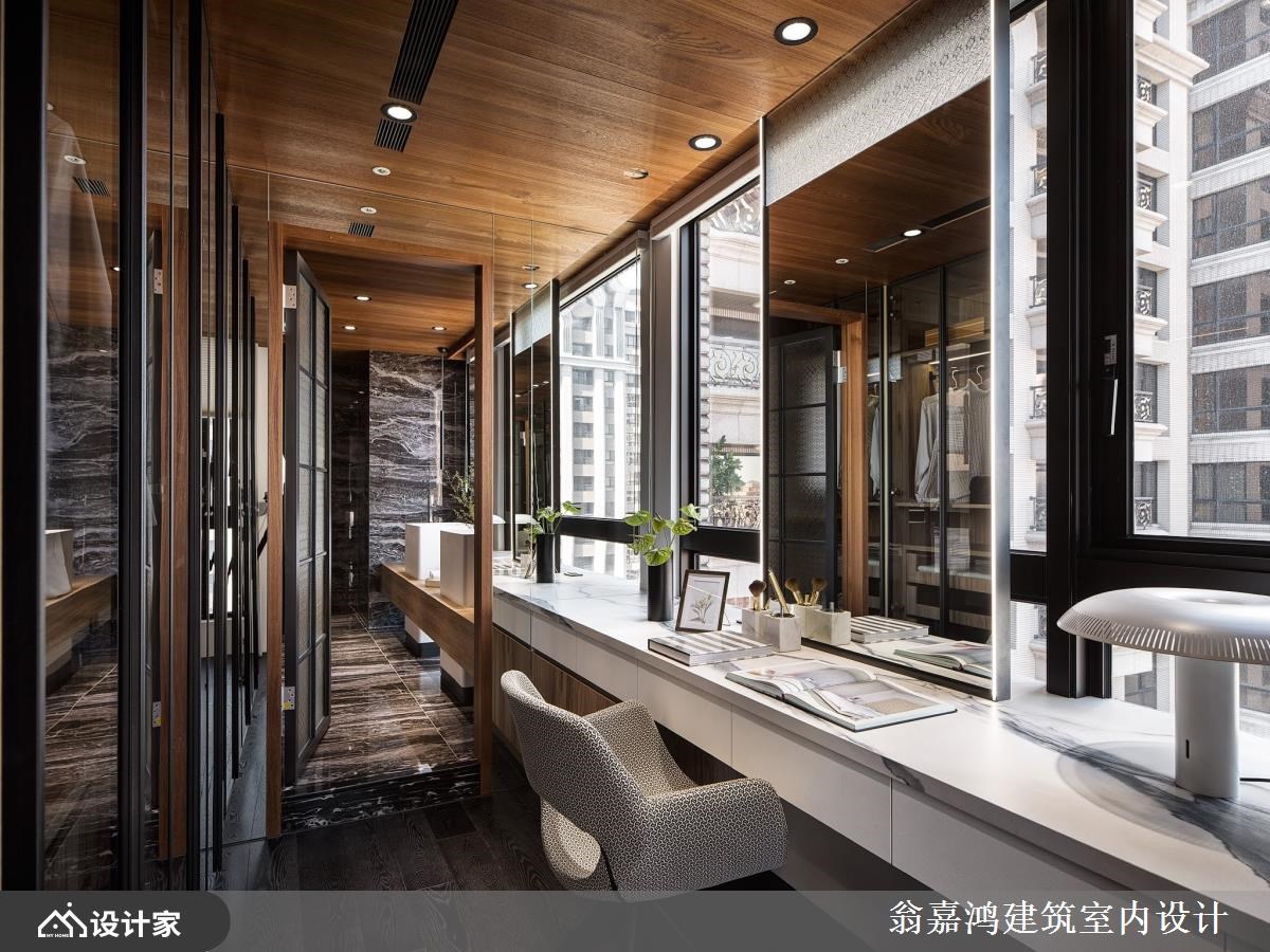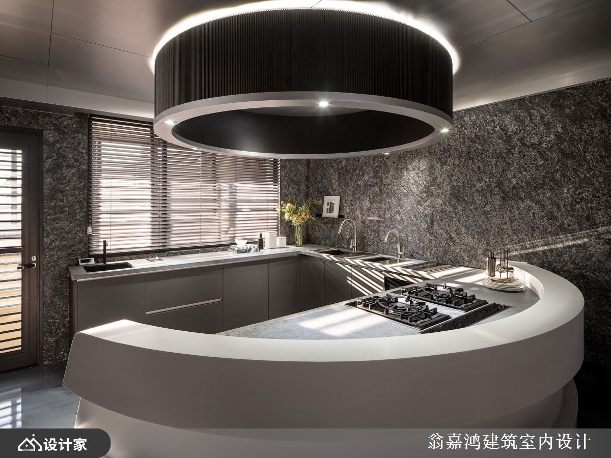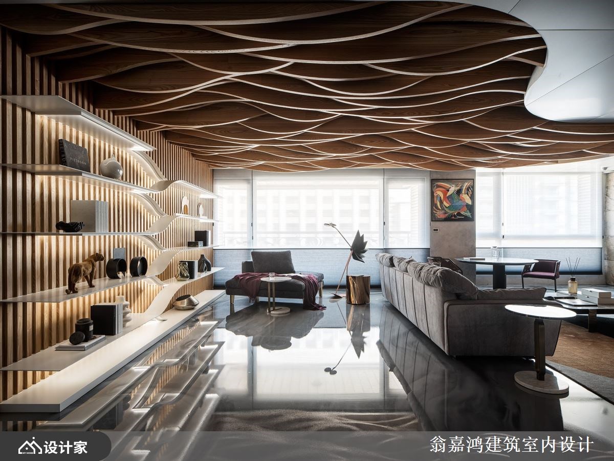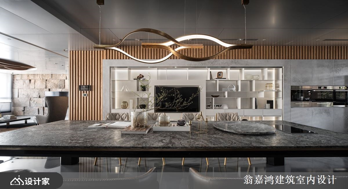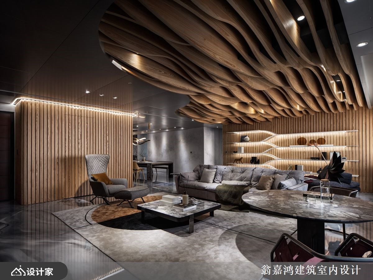 以风格鲜明及特殊见解享誉业界的翁嘉鸿设计师在设计私人豪宅方面可说是战绩显赫,面对各式各样指定的案主都能以细心聆听且迅速地掌握重点核心,再投其所好量身定制专属高订宅。 【弧形天花板,延续野性的呼唤】 走入屋内,由天然石皮及木作所堆叠出具有粗旷及野性的客厅公领域,借着凹凸错落的肌理纹路,搭配灯光创造不一的光影景致;天花延续野性的呼唤,利用弧形作出如海浪如云海的自然景致。 深入探索餐厨场域,利用圆弧设计界定出料理机能区,各自分别的烹饪区及备料区延伸高级私厨的专属享受;壁面佐以木栅及光影的相舞,创造别致又特别的空间表情。 主卧空间,选以经典黑、白对比作为主题创造现代休闲风的利落沉稳;床头墙设计注入对称美学的艺术工艺,并有效利用后方空间,辟出一隅完整机能的衣帽间,搭配仪容镜及木质梳妆台创造一站式着装空间。 小编的最爱 全屋各区空间看似彼此相邻,却又各自分别;宛如穿梭于丰富精采的异想世界,为生活细节点缀更多丰富层次。