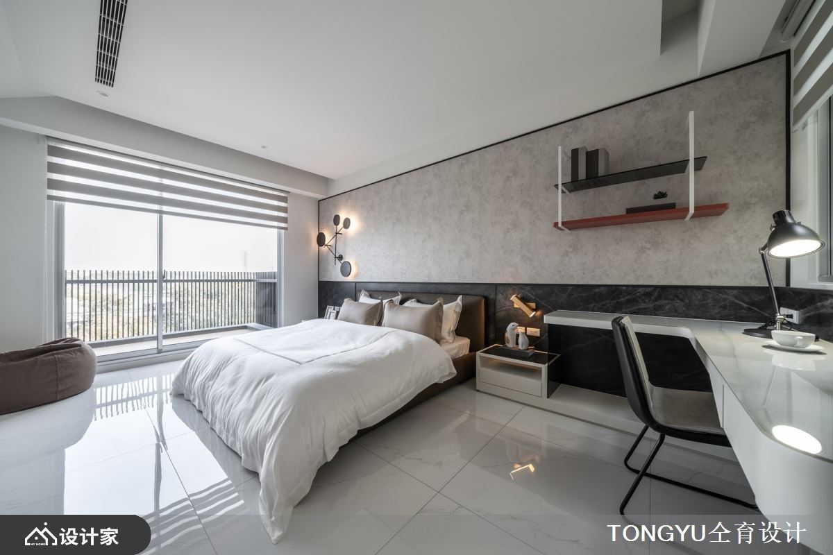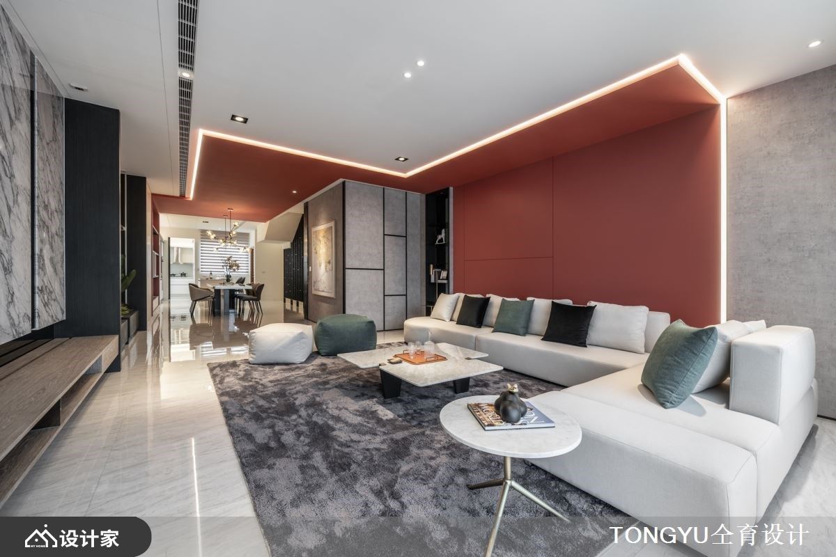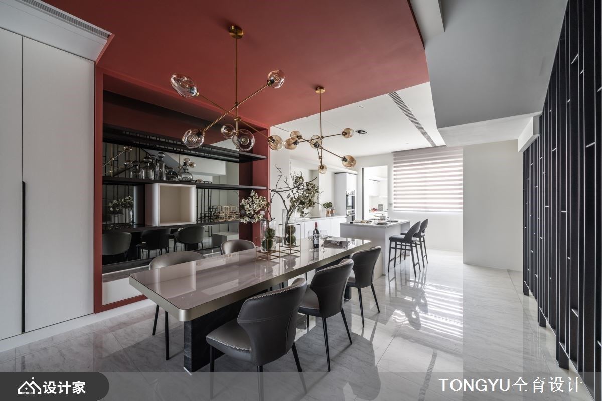 客厅的沙发背墙以爱马仕橘为基底,延伸至天花板到餐厅区天花板,串连客、餐厅领域;其中以LED灯游走边界,创造出摩登时尚,注入温度、时尚感的居家场域。餐厅领域里,将餐桌与轻食区的中岛串连,可满足假日亲友到访时,举行派对的美味飨宴;备餐柜设计上,以镜面衬底、铁件层板的巧思安排,流露现代利落之美,镜面可反射室内情景,放大空间感。