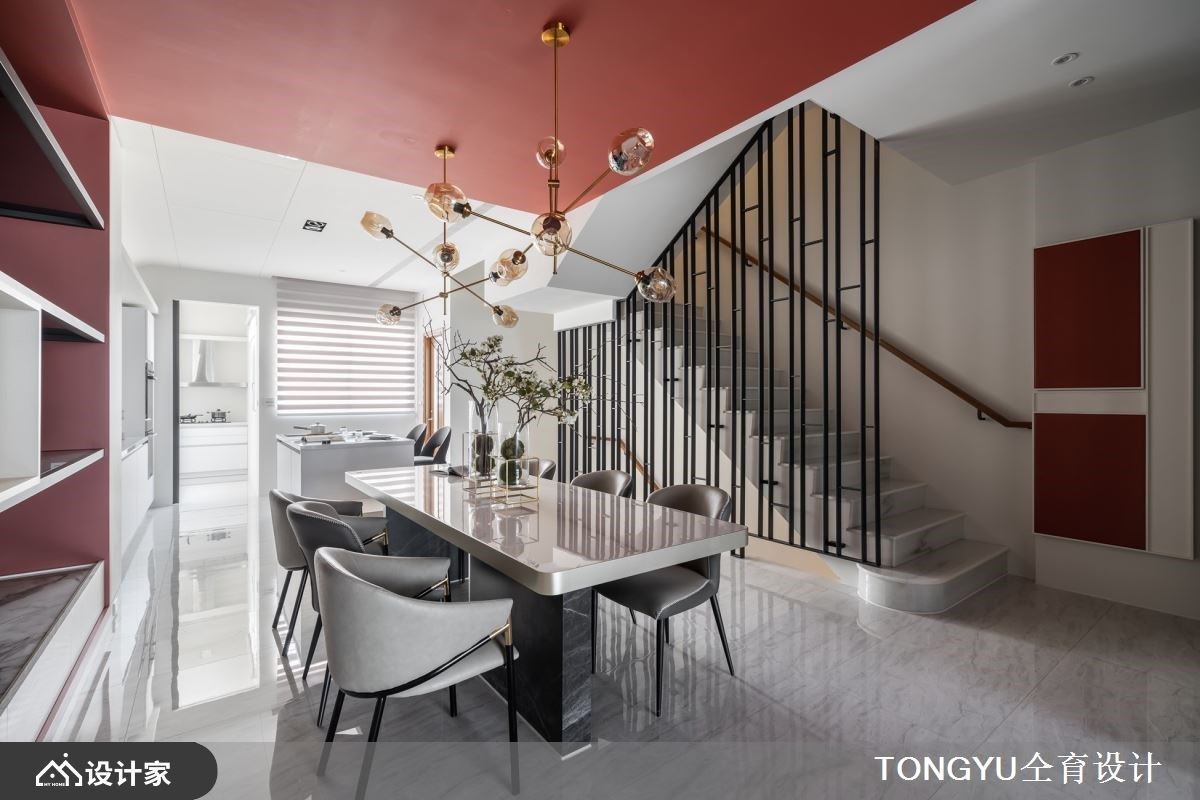 仝育室内装修设计的庄媛婷、郑瑞文设计师,在现代风独栋楼里,透过墙纸、铁件、大理石、美耐板、灰玻、木纹的搭配,展现清爽利落之美,并藉由爱马仕橘的暖色系与异材质活用,刻划出非凡时尚与度假氛围。