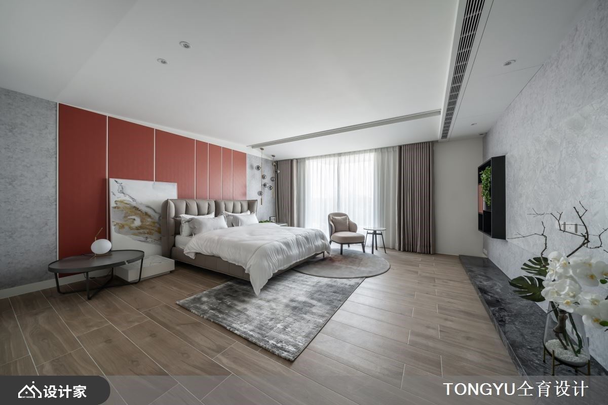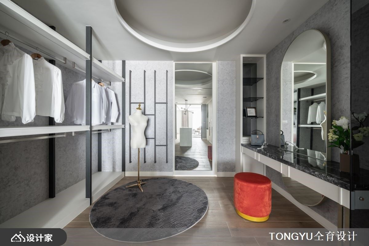 主卧规划大型更衣室,融入圆形的典雅设计语汇,精致质感的梳妆台,加上抽屉式配件与服装展示收纳,体现服饰穿搭的仪式感。