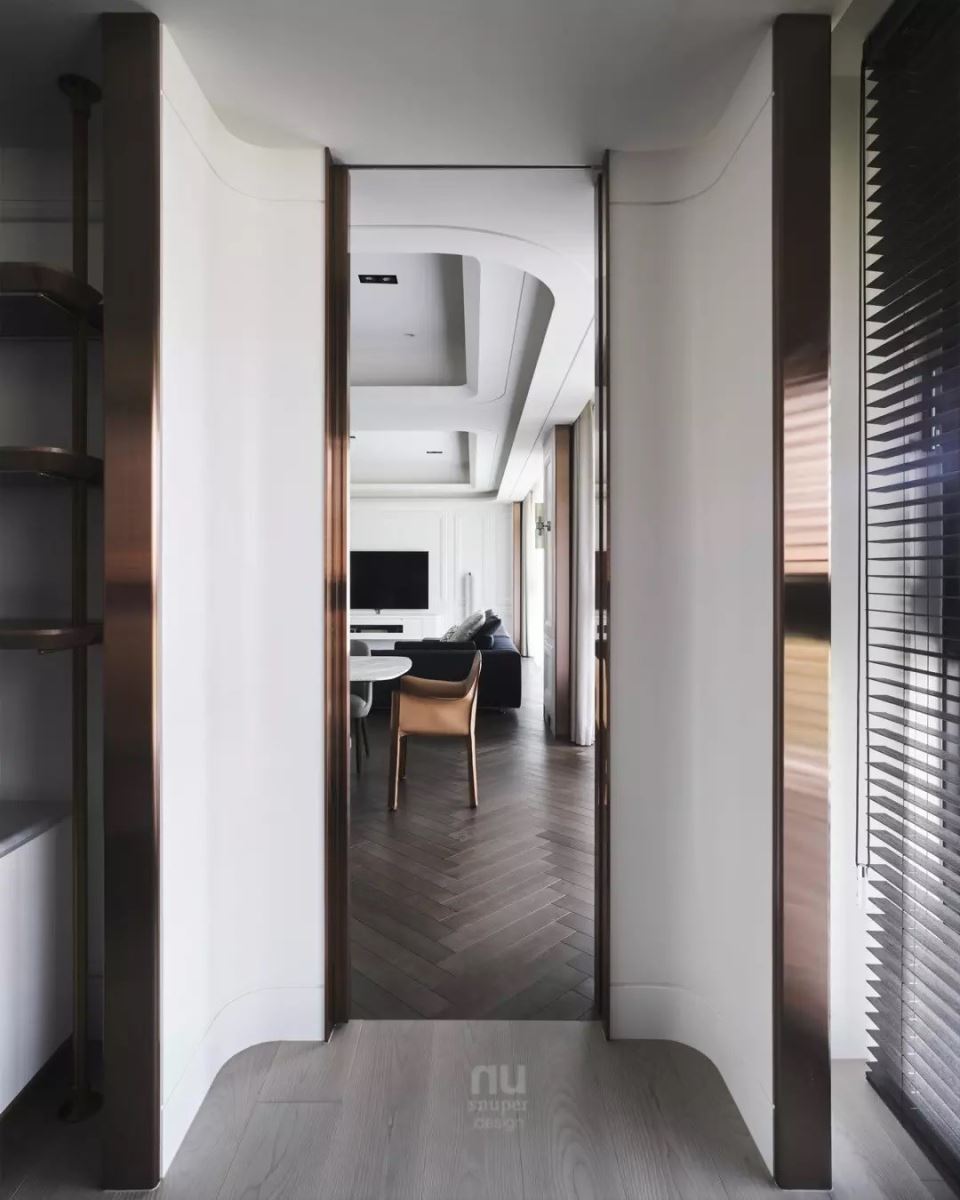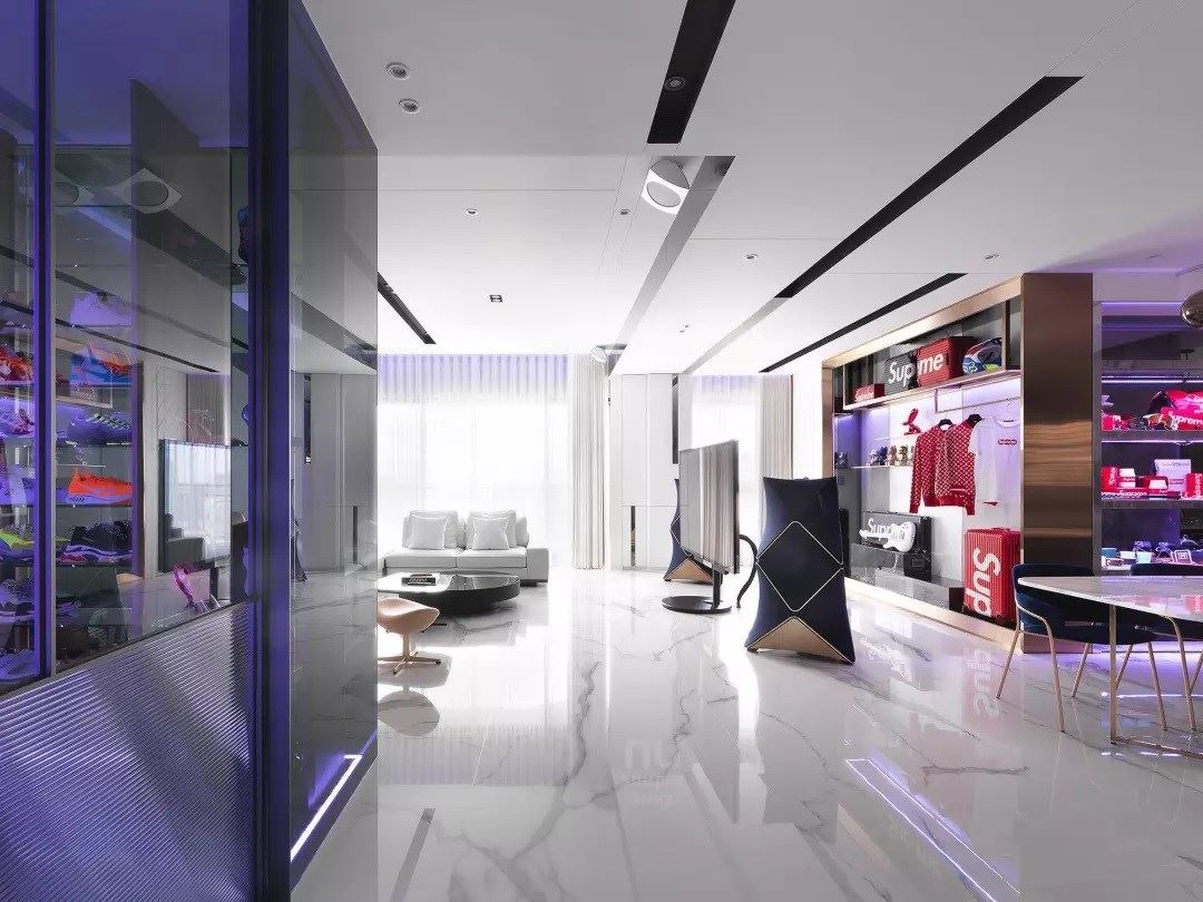 这个家,自己定义自己的“美”,用时尚态度,也是最初打造这个家的发想,集合了屋主各种玩味的服饰、鞋、家具、音响,在白与金的基调下,转换不同空间的情境氛围。线性流动与速度串流于公共空间,在一体的格局配置中,却有不同角落的视觉片段。