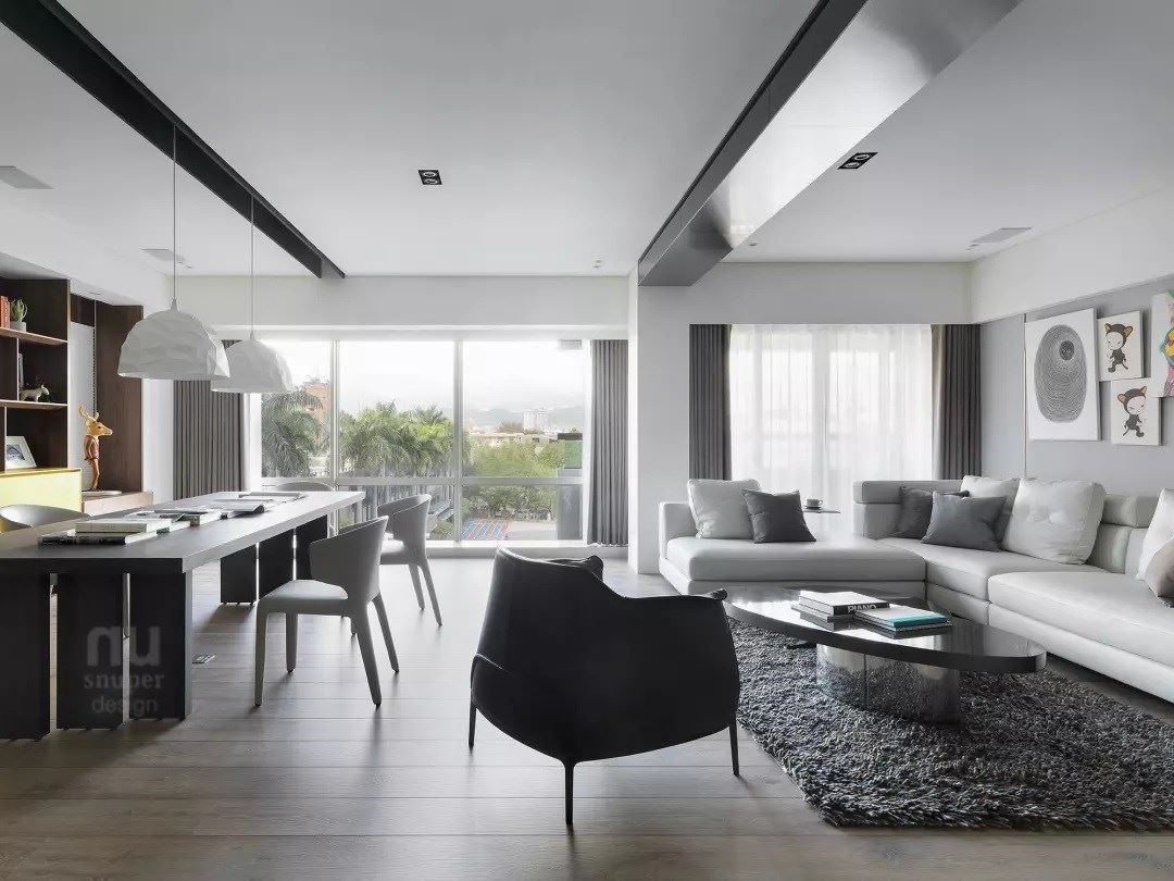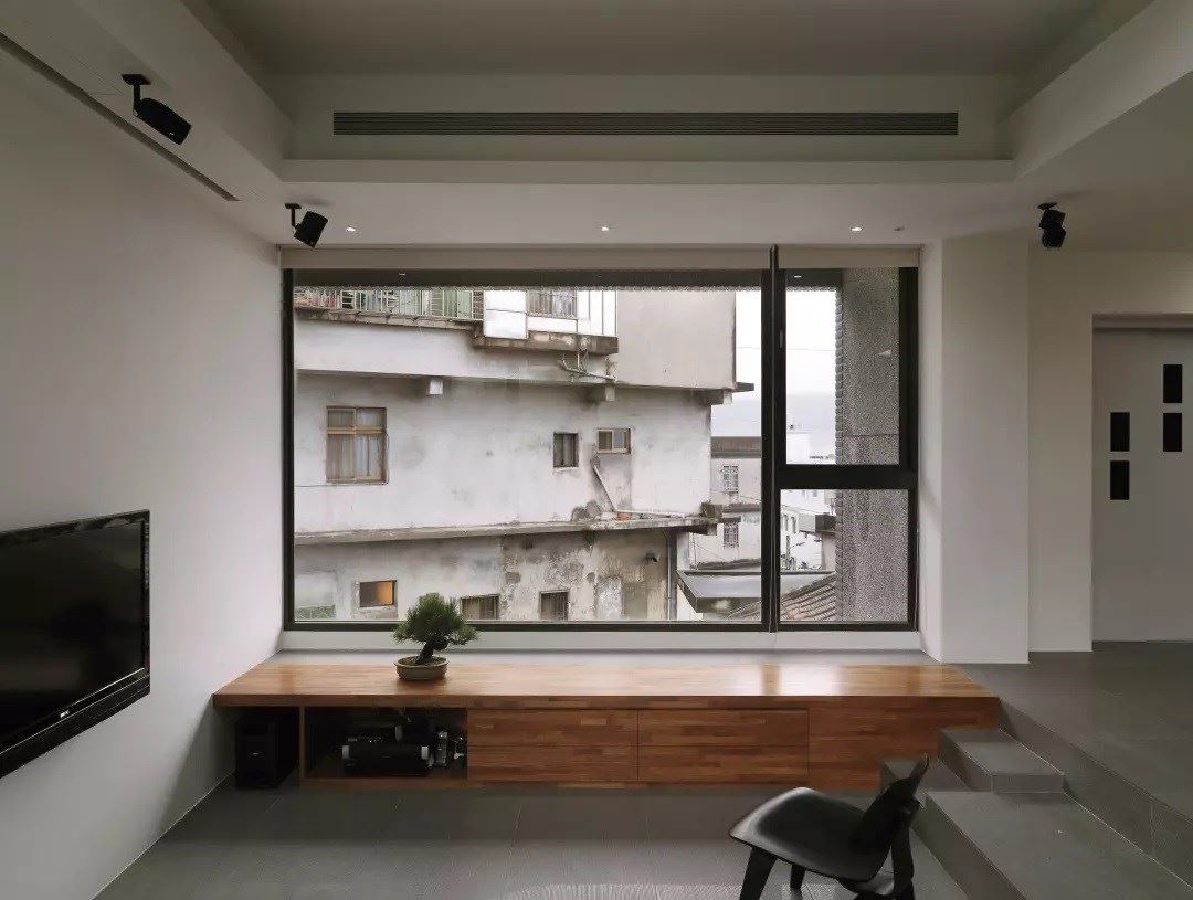 在格局的规划上,为了让不甚宽裕的空间看来更为宽阔、有气势,采用大平层的规划,在公共区域的部分置入开放式书房、客厅和厨房,迎入落地窗的光、风、雨、树,将最棒的景致留在此处。