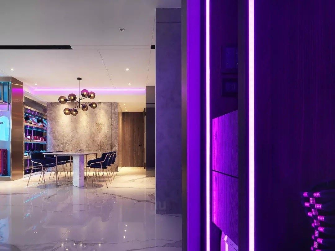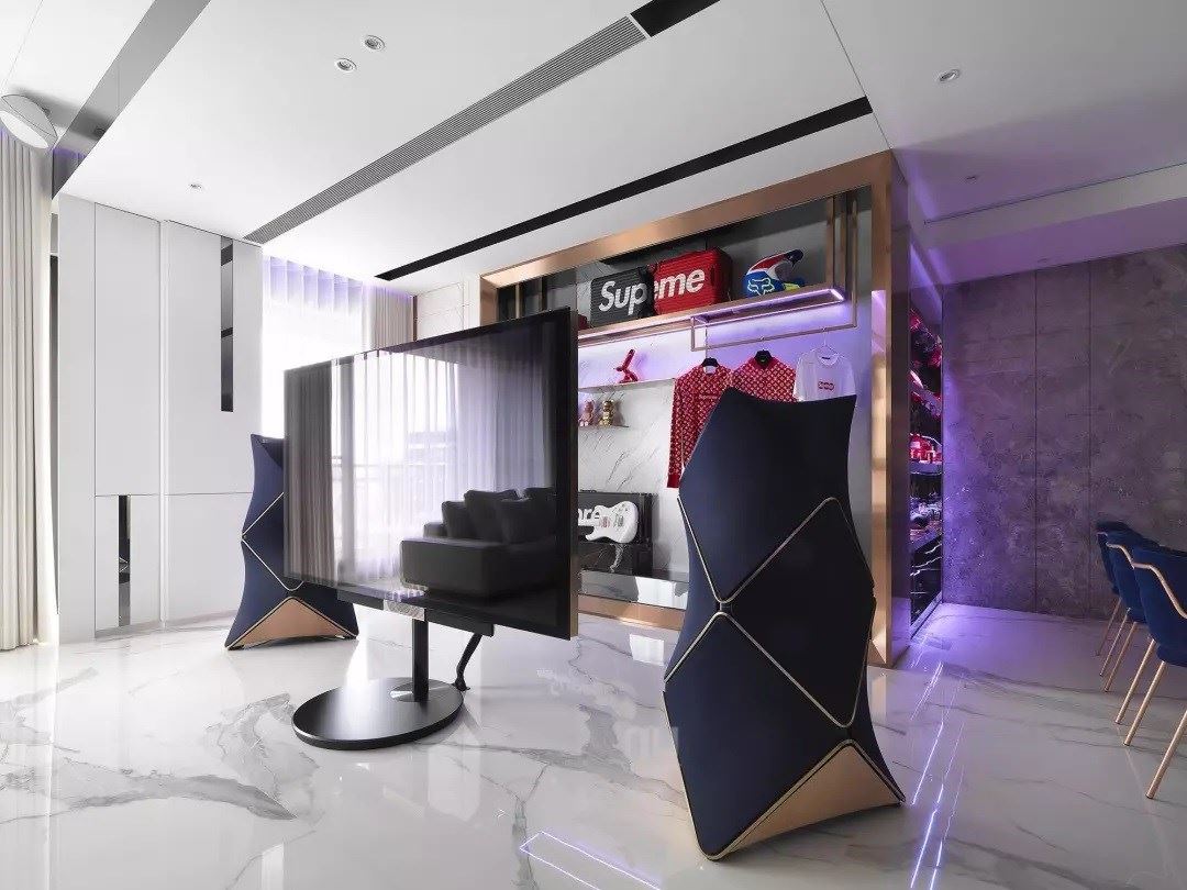 这个家将每个空间角落创造为一个景,每个材质、片段、碎片都是一个画面,从公共空间的简洁现代走入私领域的柔和与华丽,碎片般的场景,在石纹的基调下流露两种空间语汇。灯带的幻境感,以视听音响为中心环绕,让生活多了真实之外的可能性,拼贴每个生活区块,表现出神秘感与迷幻的张力。