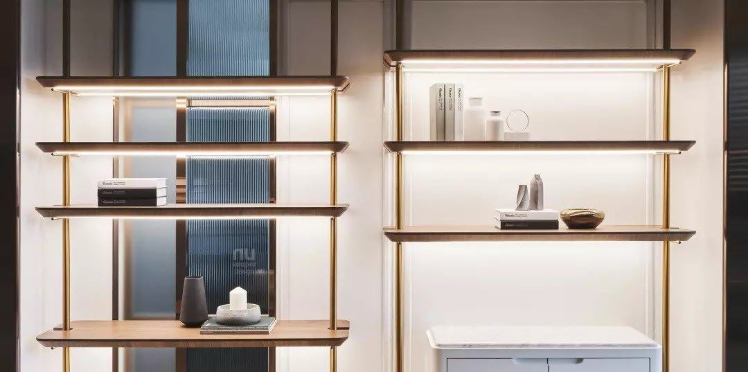 「橱窗」,是生活趣味的核心,转折玄关旁的鞋室光盒子、电视后方的 L 型精品橱窗、主卧更衣间的衣饰天堂,超越机能之外同时成为视觉焦点。