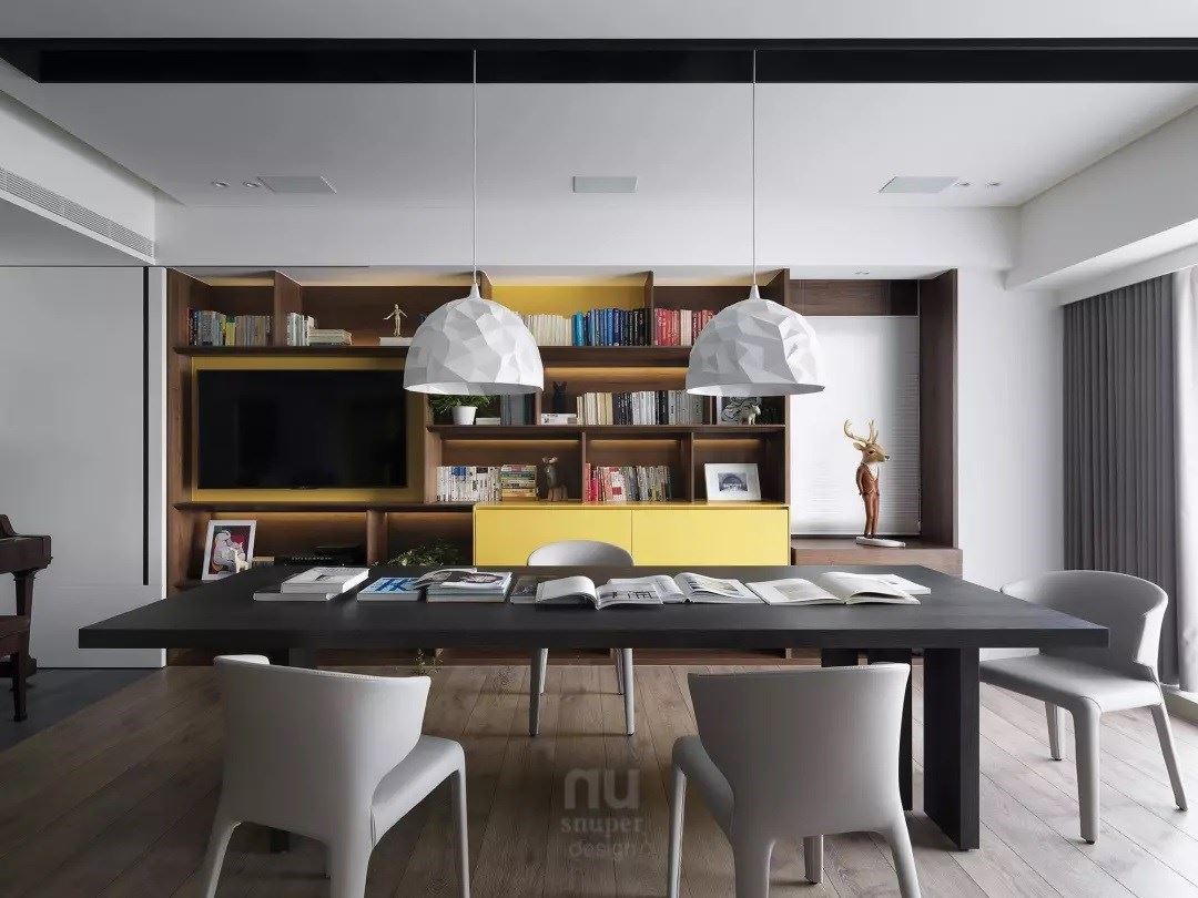 我们以一面超大书柜,构成独特的精神世界,运用屋主指定的柠檬黄与木皮交错,通透、层次分明柜体,通过圆润的导角增加细节,圆满一家人喜爱阅读的兴趣。