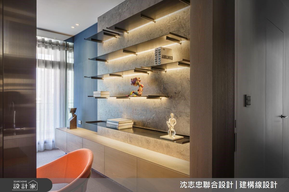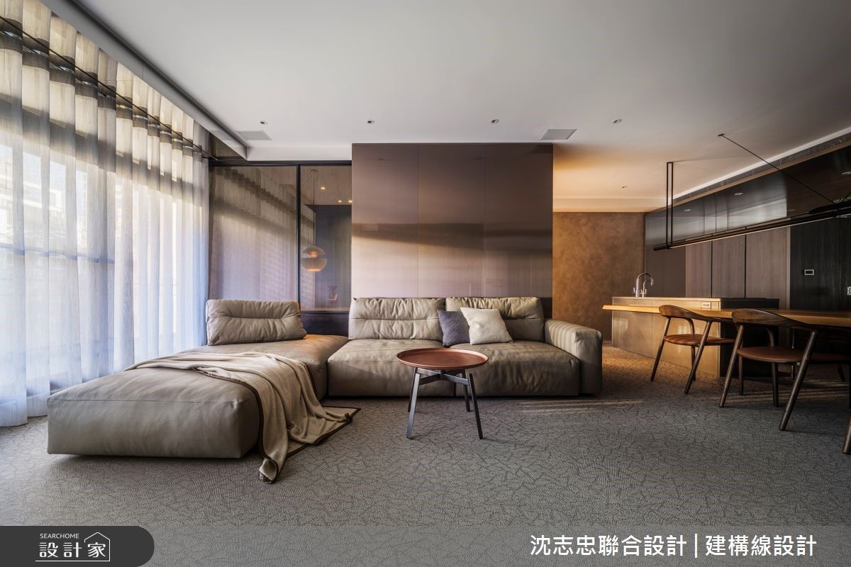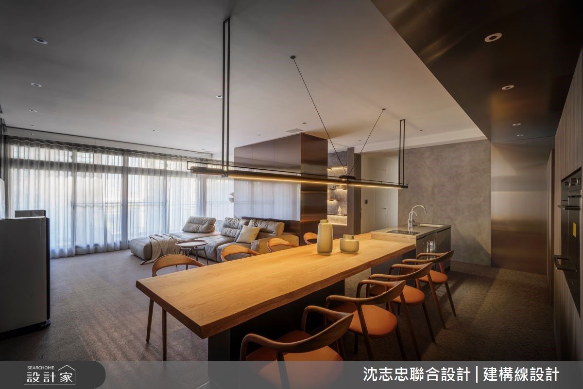 改造指南 1. 让40坪看起来有60坪的尺度 2. 利用通透隔间、开放公领域引入采光 3. 运用材质界定开放空间,保有实用机能性 设计师这样做 42坪的新成屋,居住人口为4人,屋主希望放大公共领域,成为家中凝聚情感的处所,在设计上则保有精品现代风格,展现品味。沈志忠联合设计在符合机能范围内发挥创意的最大价值,善用比例、线条、材质,再搭配细腻的施作工法,完成高端质感的精品之家。 想要让空间看起来比实际坪数宽裕,最好的方式就是在空间中放下大尺度的餐桌与中岛。从玄关转折进入空间,大型的原木长餐桌与中岛台面接续无缀,让此处既为轻食区,也是迎宾宴客之所。 书房与客厅利用毛丝面不锈钢结合清玻璃制作出区隔,藉此将两扇窗扇的采光整合,让公共区域更加明亮迷人,并结合可推移的冲孔板,有需要时拉上可维持隐私,但不阻碍光线分享。 小编最爱 客厅、餐厅、轻食区与书房,通过开放、穿透等材质串联,电视墙使用具有水墨纹路的大理石,与作为书房隔间的毛丝面不锈钢对望;而轻食区则以不锈钢制作出「框」的型态,让开放式的空间有了界定,创造出具有深度的场景。