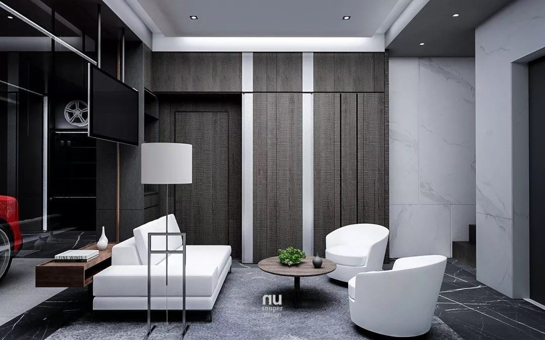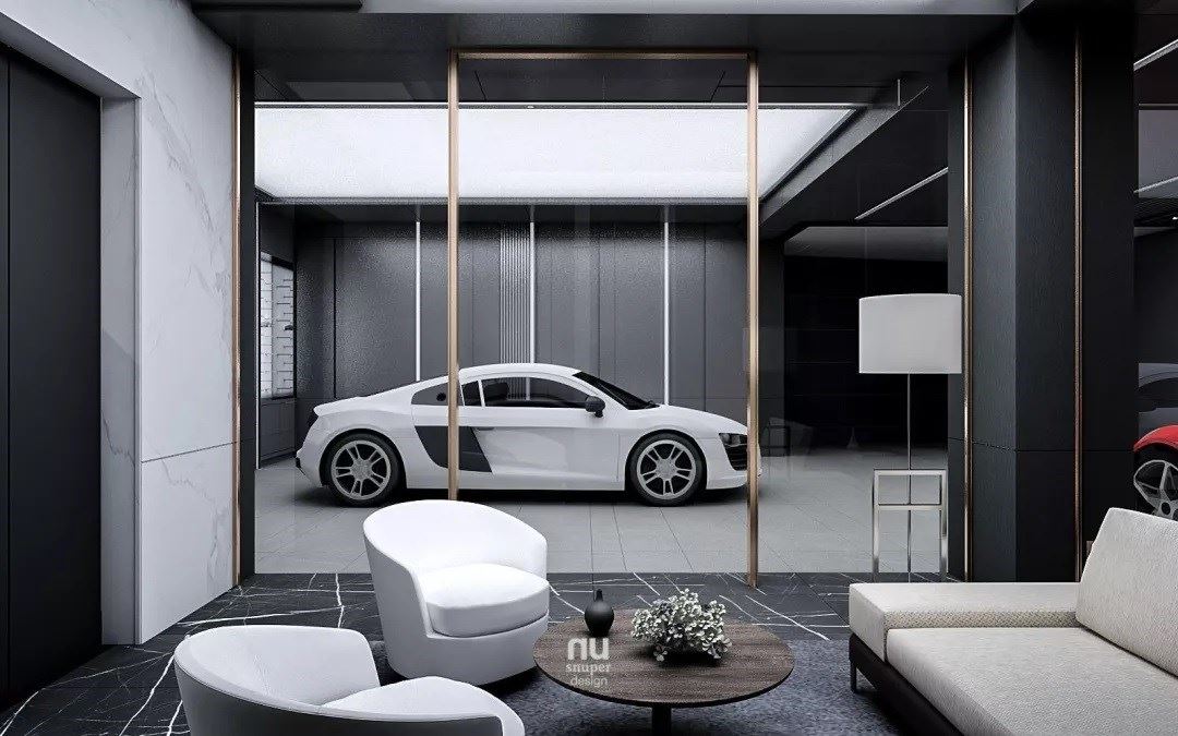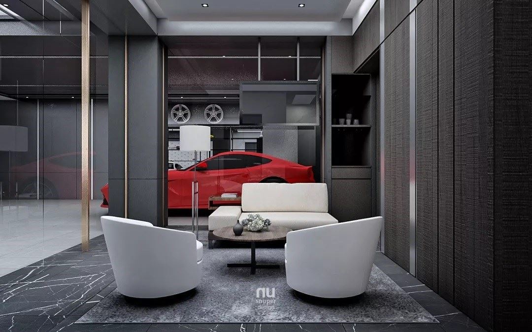 旁侧为男主人精心准备了专属的赏车角落,精选流线型的义式精品 b&b italia 沙发和主人椅,大面落地玻璃、均匀光源,无论是独自一人或与朋友小聚,都能一边欣赏着私人的跑车收藏,融入生活的灵魂、将烦恼抛诸脑后。