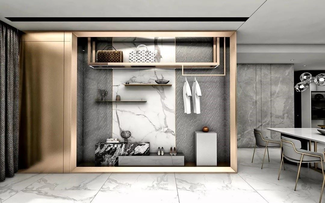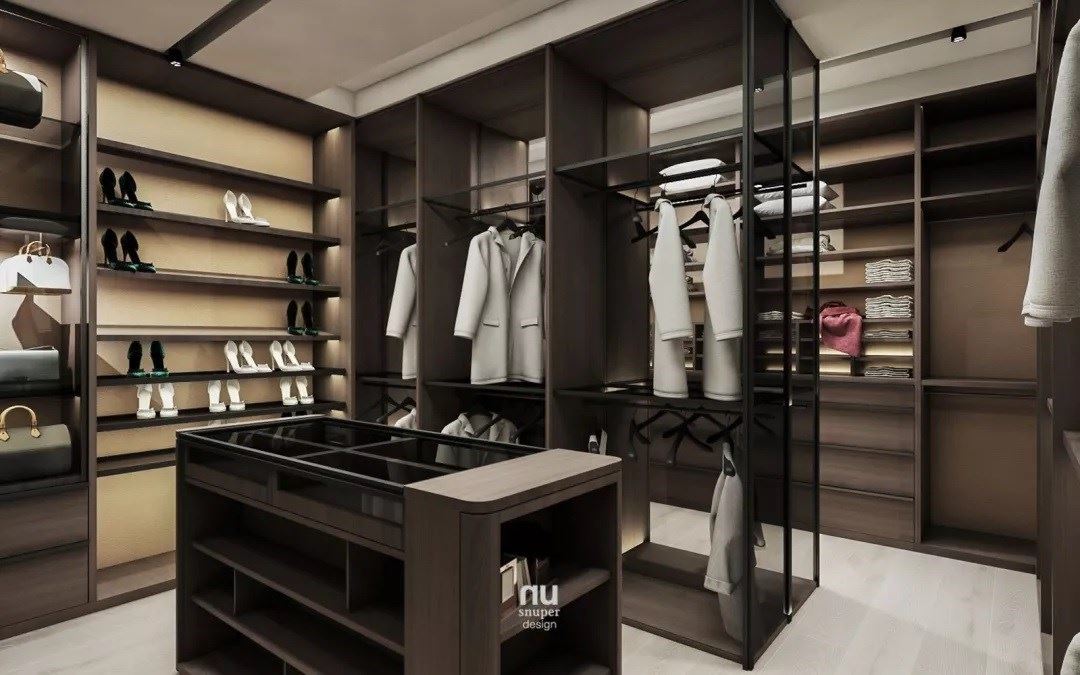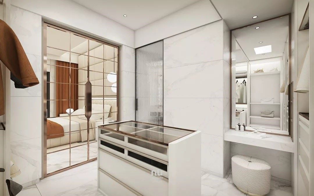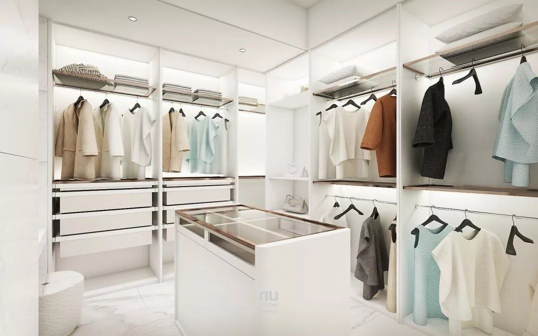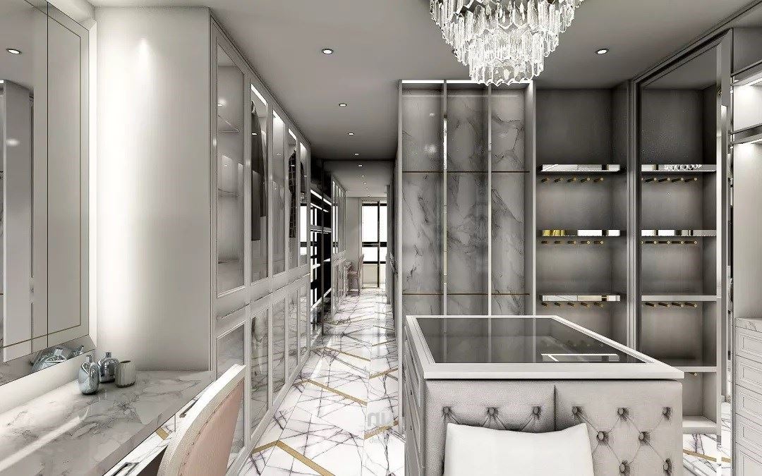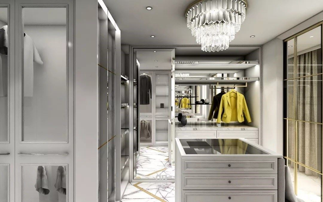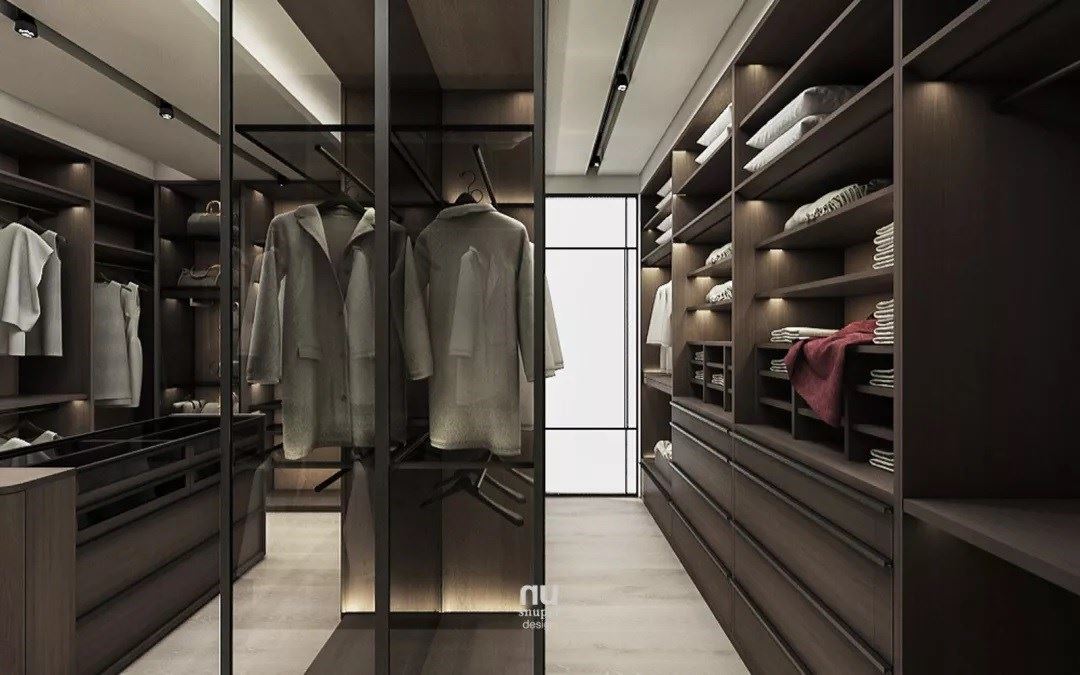 更衣室的设计上极度讲究、细致,比如灯光、层板规划、湿度调节等方方面面都需十分注意,同时,设计更需呼应整体空间的风格,因此可藉由线花装饰、或是木质的色系不同,分别展现出现代时尚或深色人文等风格。