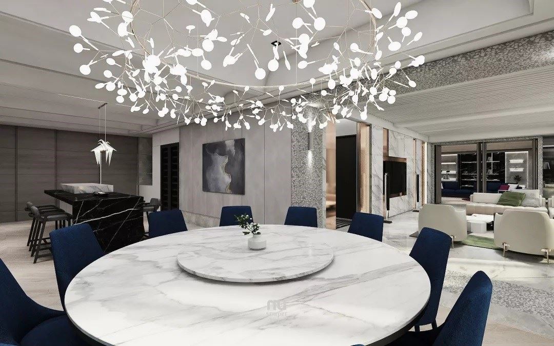 本项目完成于 2018 年米兰家具展之后,因而融入了许多大胆前卫的设计手段。在主视觉灯饰的选择上,以荷兰设计品牌 Moooi 戏剧化的灯饰为要角,飘浮在空中如云般的灯光,将时光的优雅停留此刻,摩登时尚、成为不可忽视的力量。