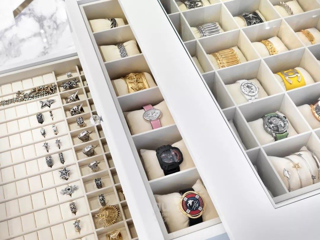 在足够宽敞的空间中,都绘制放进一座中岛台,规划前先与屋主计算摆放的品项、件数,进而分门别类规划,通过不同的分隔和分层,让每一样对象不只是被好好收好,更是被作为展示品呈现。