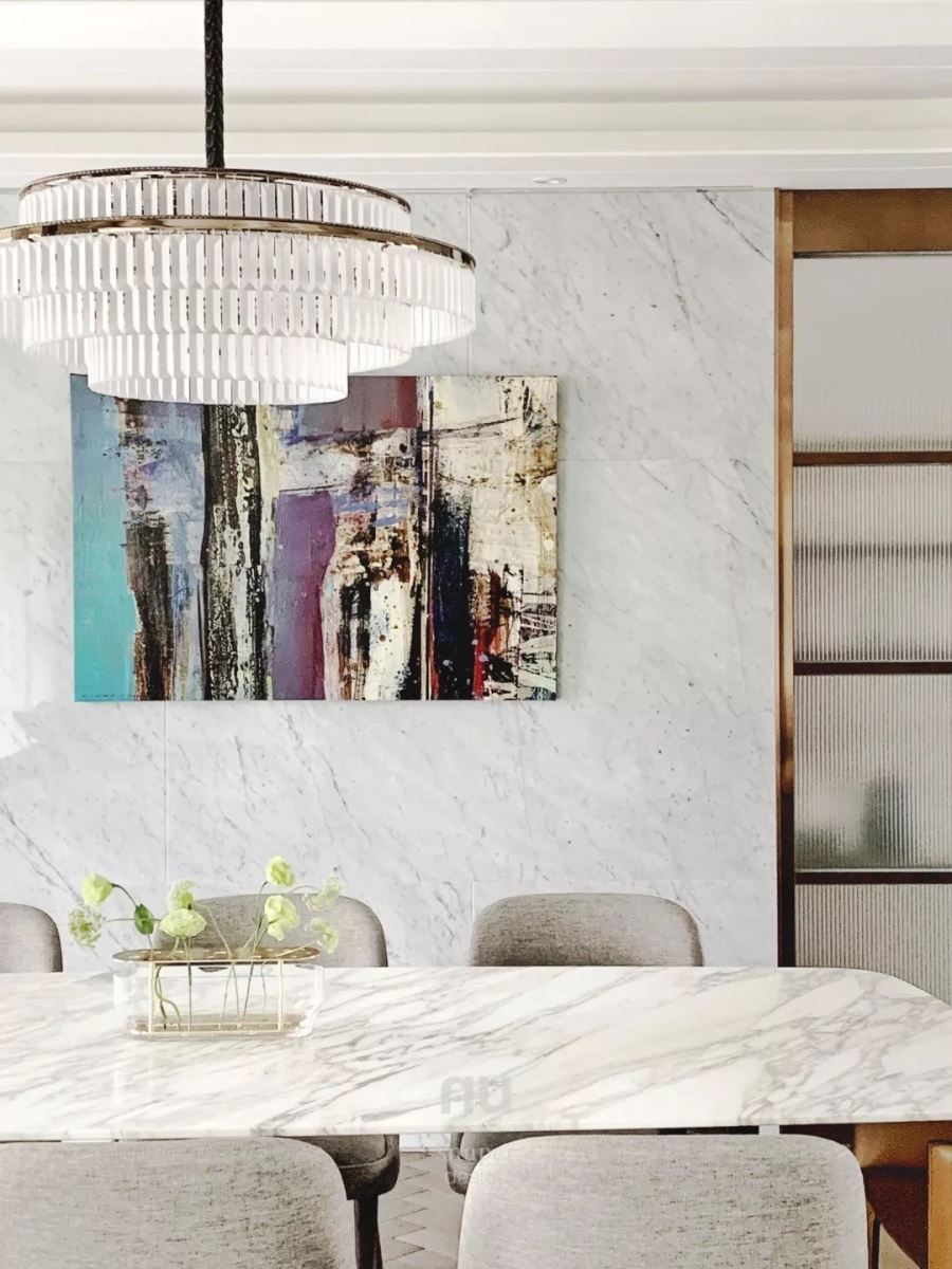在空间设计时要适度留白,为屋主预先留下可摆放艺术品的区域。整面墙面预留给屋主放置自己的画作,让用餐空间也多了能欣赏画作的地方。