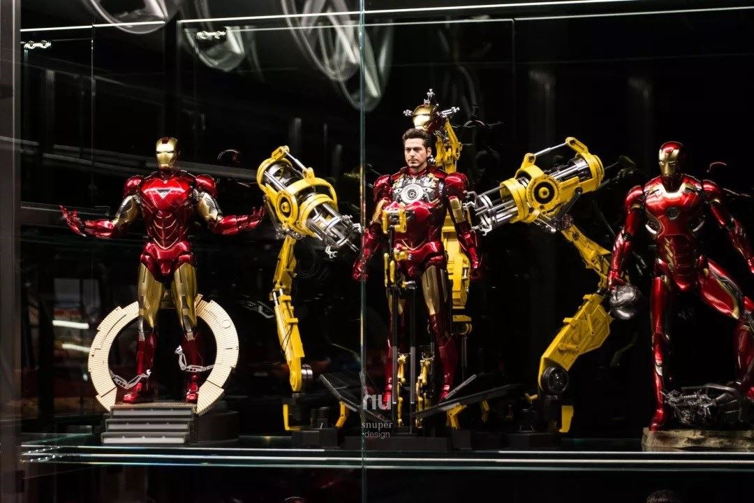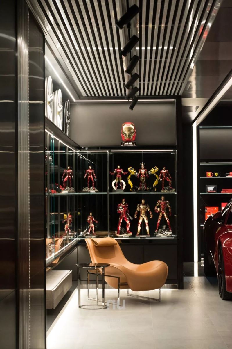 订制透明的压克力材质与光线配合,将男主人的汽车模型收藏和钢铁侠,依照大小比例依序给予适当的收藏位置。