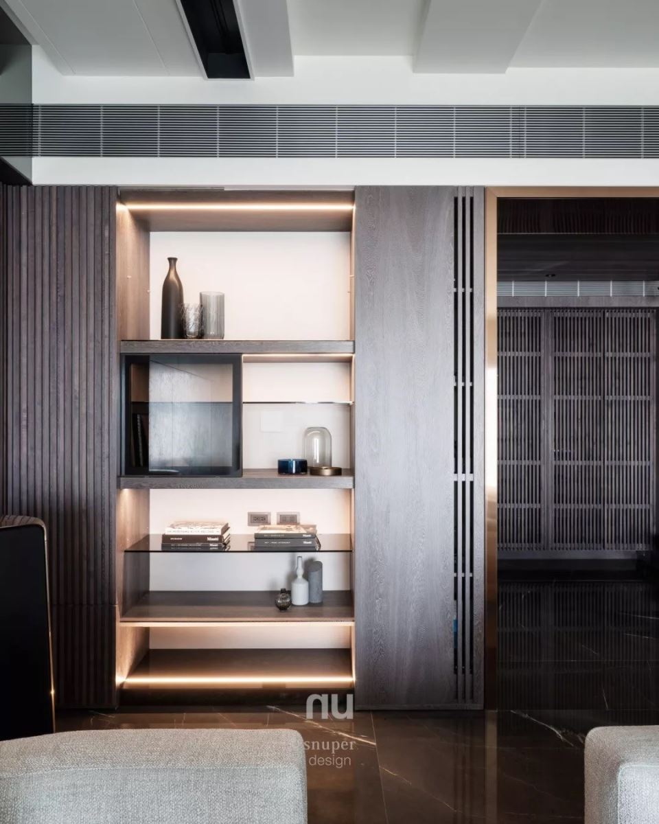 開放式展示柜,玻璃、木头降低收纳柜的重量感,却多了更多精品质感;其中尤其注重灯光布局的展现,让件件陈设更为精巧,在满足功能的同时,也温暖了空间氛围。