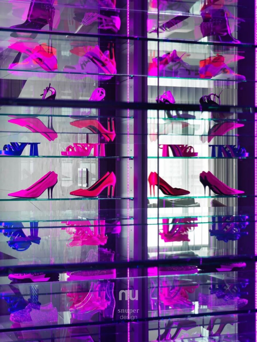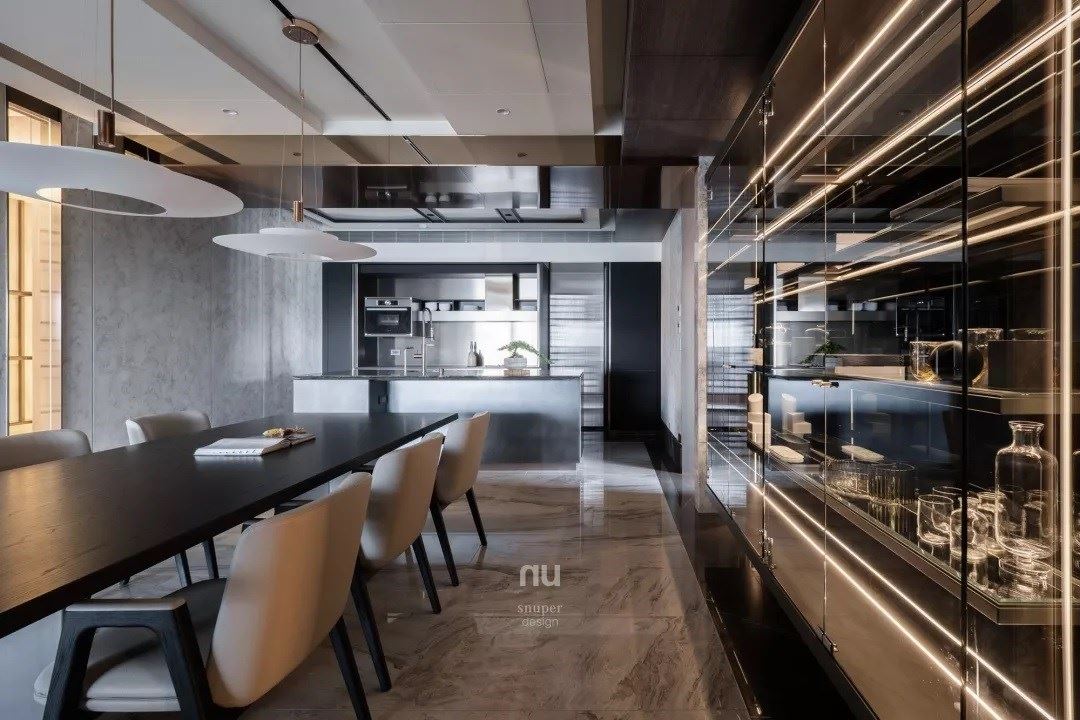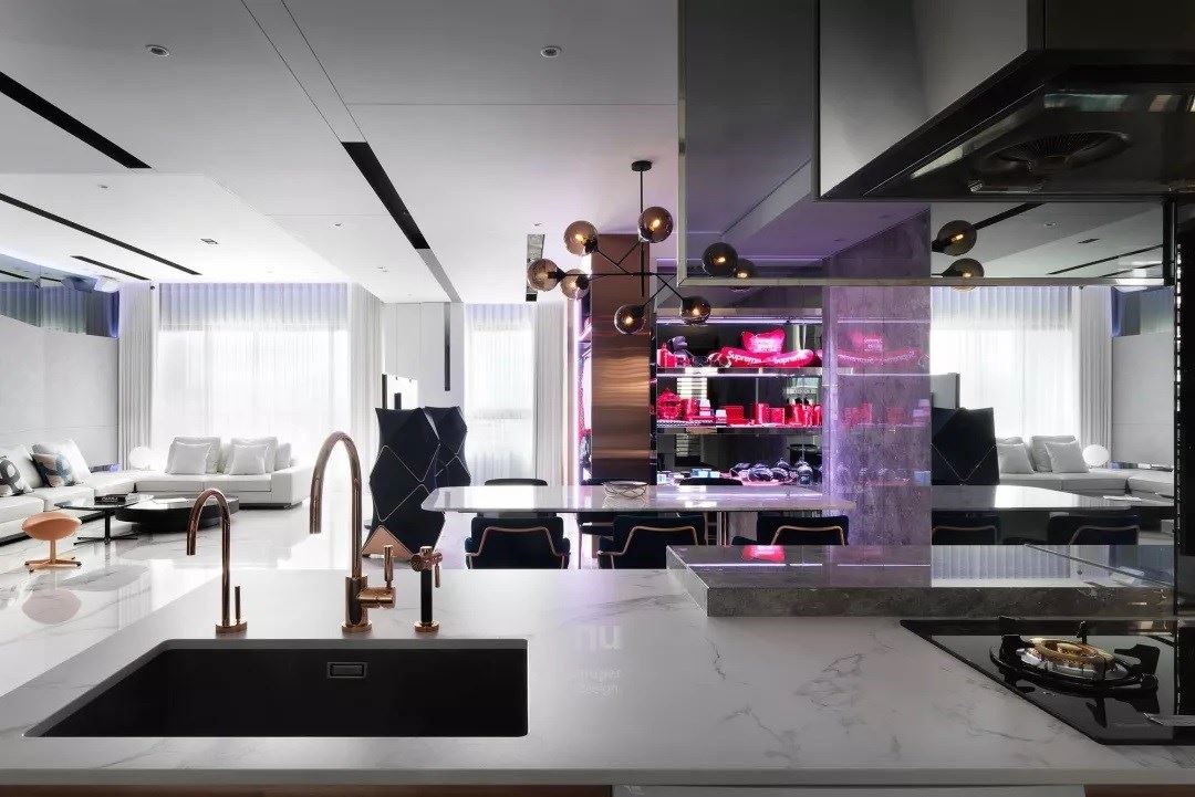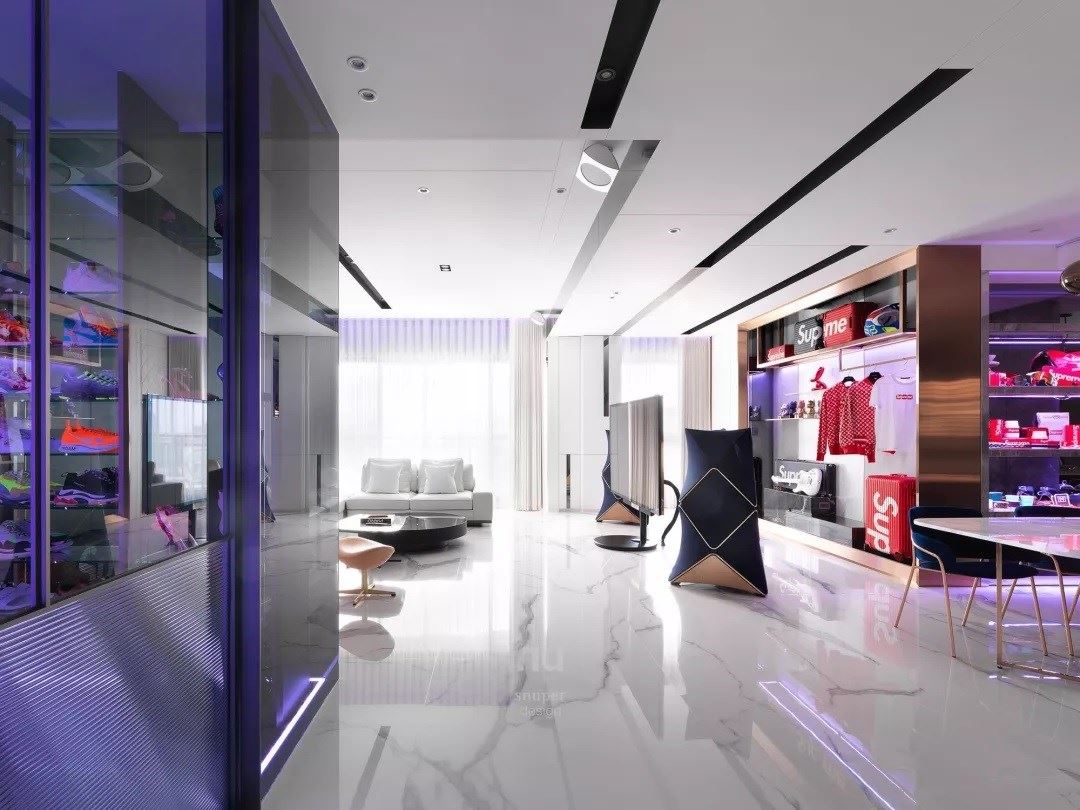 家是自我的实现,展现独特的个人时尚之处。试图将精品品牌的橱窗规格挪移至住宅之中,超乎家居尺寸的巨型的玻璃鞋室,从玄关处进入后,沿着立面延伸、转折,通过不锈钢、镀钛、玻璃及镜面的异材质结合,让每双鞋履都能被 360 度欣赏,成为表彰居住者性格最好的诠释。