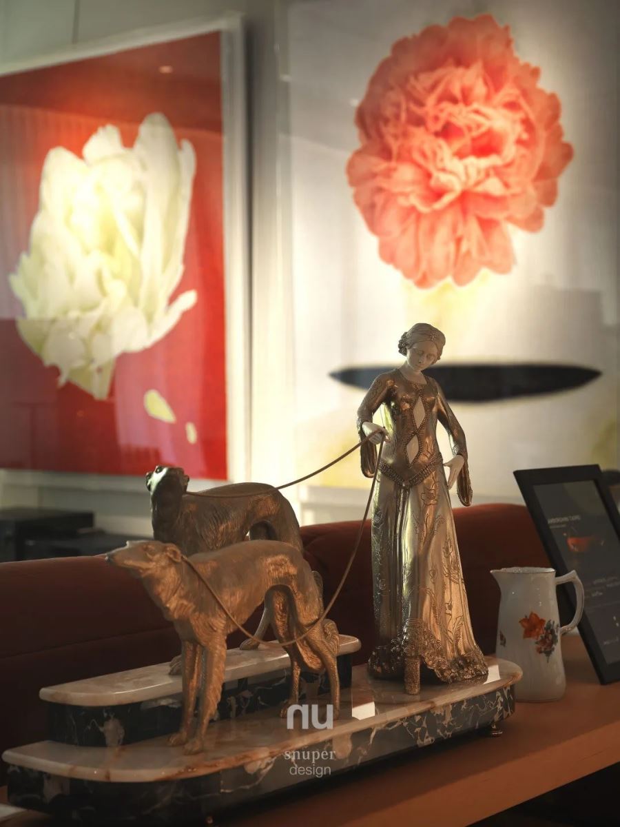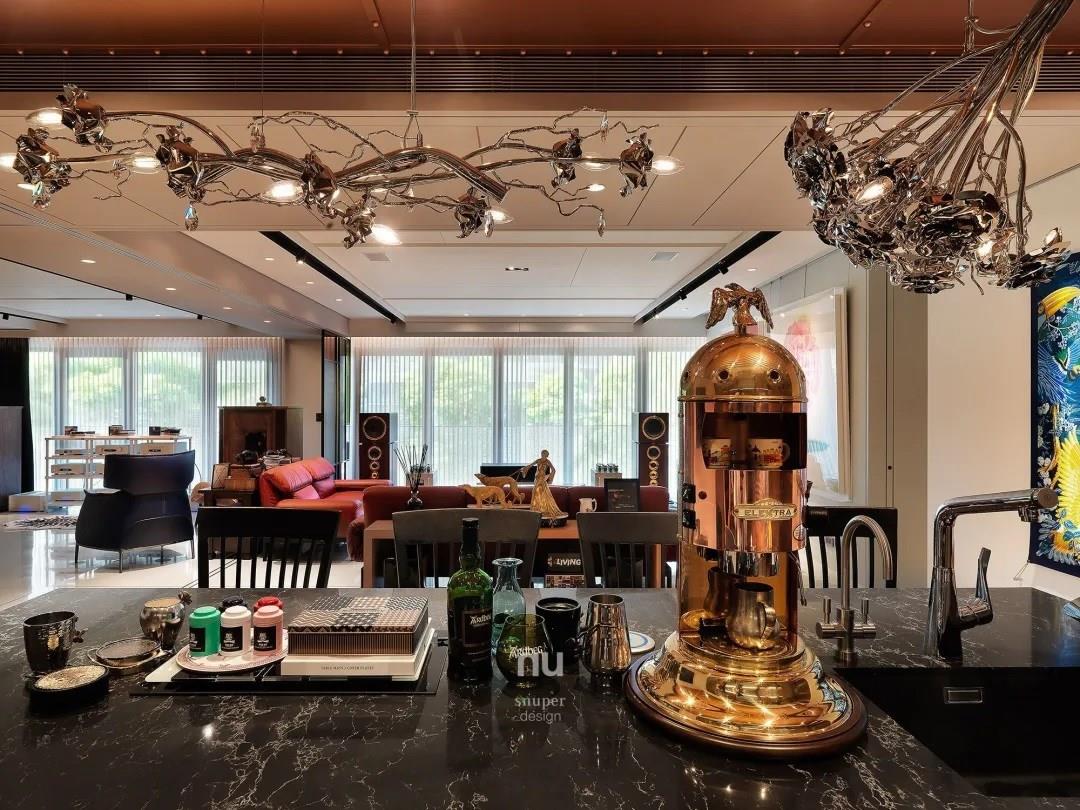 家中无处不是情境。艺术藏品、居家摆饰遍布家中每个角落,来像是自荷兰的精品灯具 Brand van Egmond,玫瑰花花瓣以金属缠绕,在柔美与刚硬间有了矛盾的反差美感;华丽外型带有古铜金与古典手感的义式咖啡机 Elektra,让生活场景多了玩味的画面。