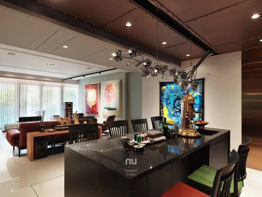 为了主人公这样独特的个性,我们将中岛设定为客厅的核心,环绕着日常写意的畅谈、品饮时光,错落的沙发单椅切分出不同的情境,艺术融入家的背景,与流动的乐章勾勒出层次饱满的生活轮廓。