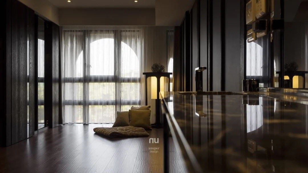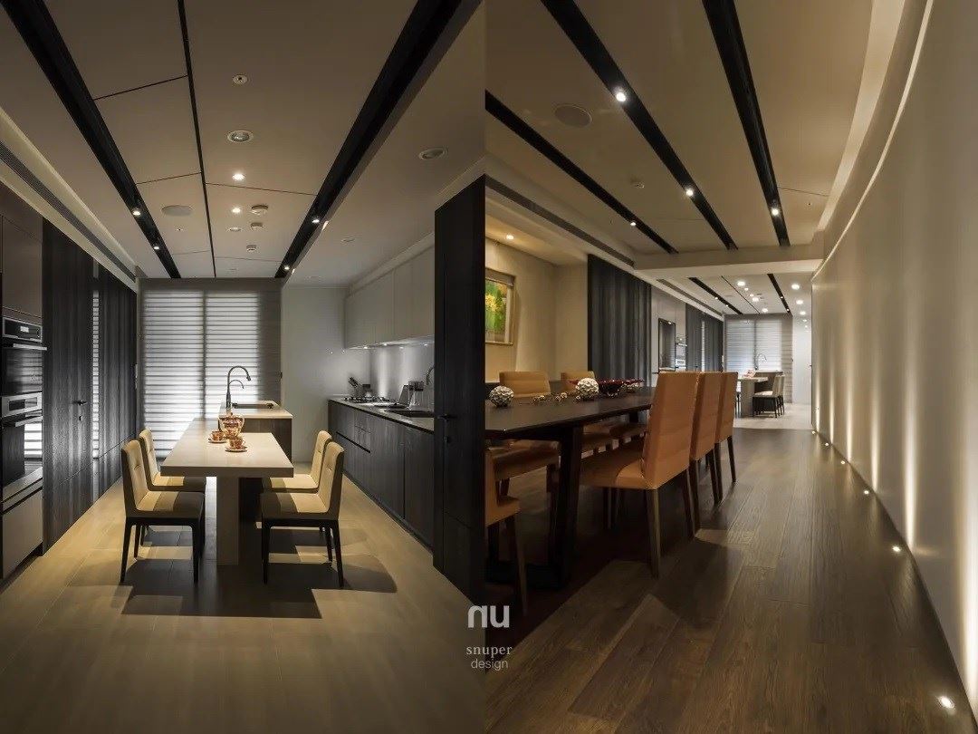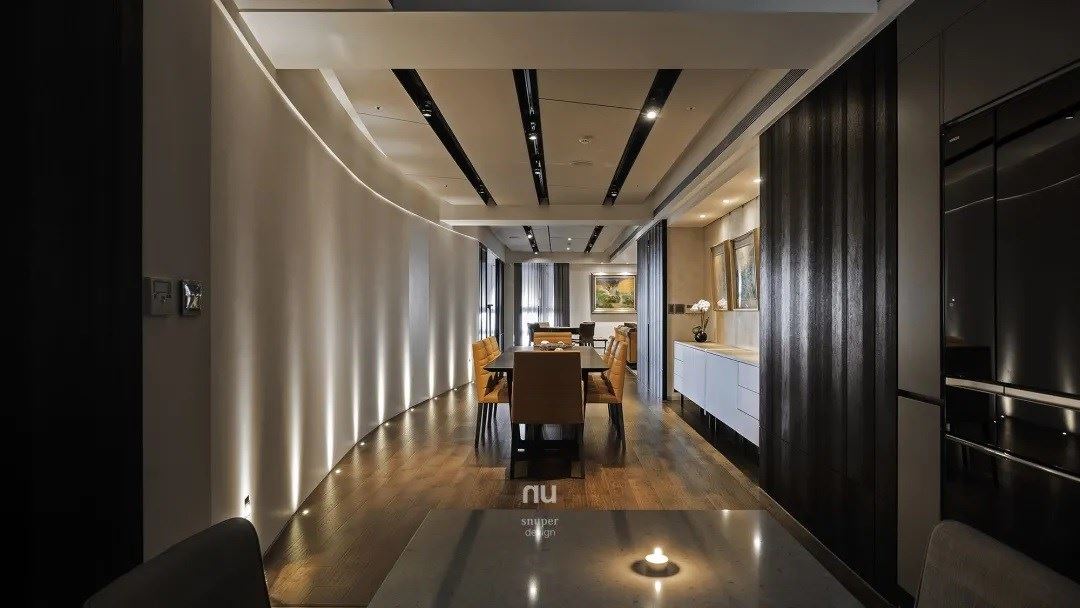 女主人喜欢舞蹈,加上她的收藏和品味为依循,利用餐厅的长廊铺陈木质地板,另简化墙面的线条,从刚硬直线化为温婉恬静的曲线,迎着 45 斜角的灯晕聚拢而登台演出,动静之间漫游轻灵,或是翻腾深沈,再再引人目光。舞台是画布,用光为画笔,一点一滴为长廊着上颜色。
