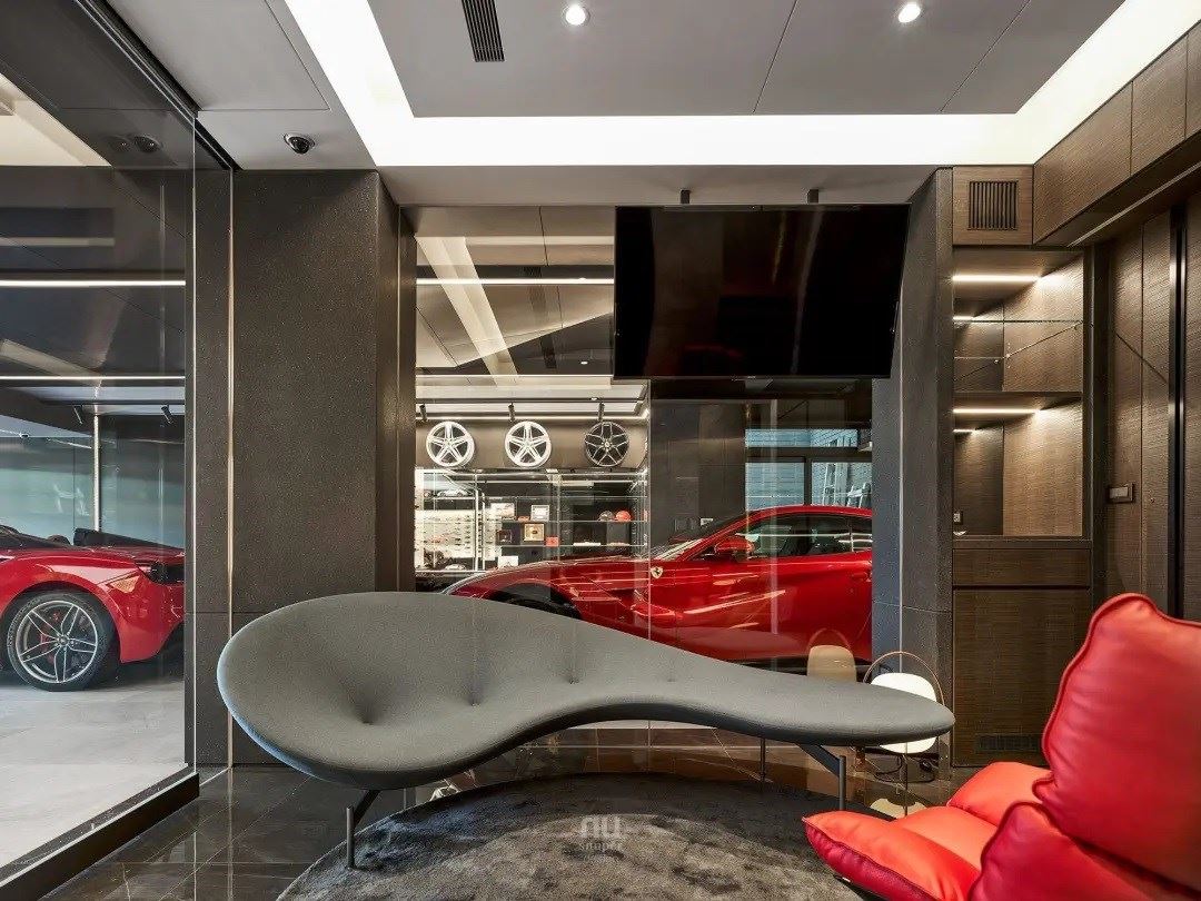 旁侧为男主人精心准备了专属的赏车角落,精选流线型的义式精品 b&b italia 沙发和主人椅,大面落地玻璃、均匀光源,无论是独自一人或与朋友小聚,都能一边欣赏着私人的跑车收藏,融入生活的灵魂、将烦恼抛诸脑后。