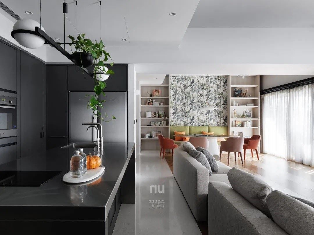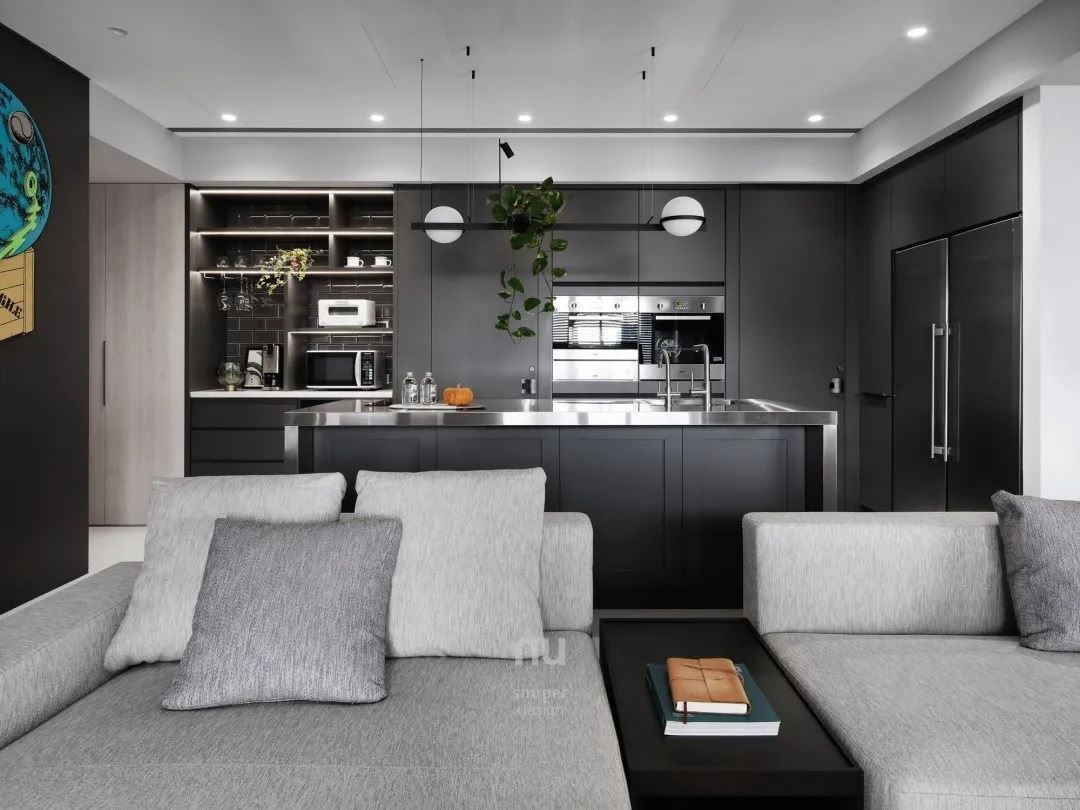 融入屋主收藏的艺术品,立面的操作上延续了厨具的深墨色,衬托着墙上来自日本艺术家金氏彻平的作品“游戏、舞与结构”,更添增了当代生活的趣味以及无限的想象力。 没有过分修饰、空间蕴藏的是真实情感。