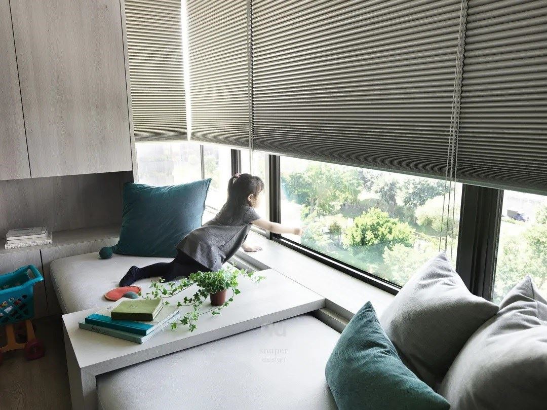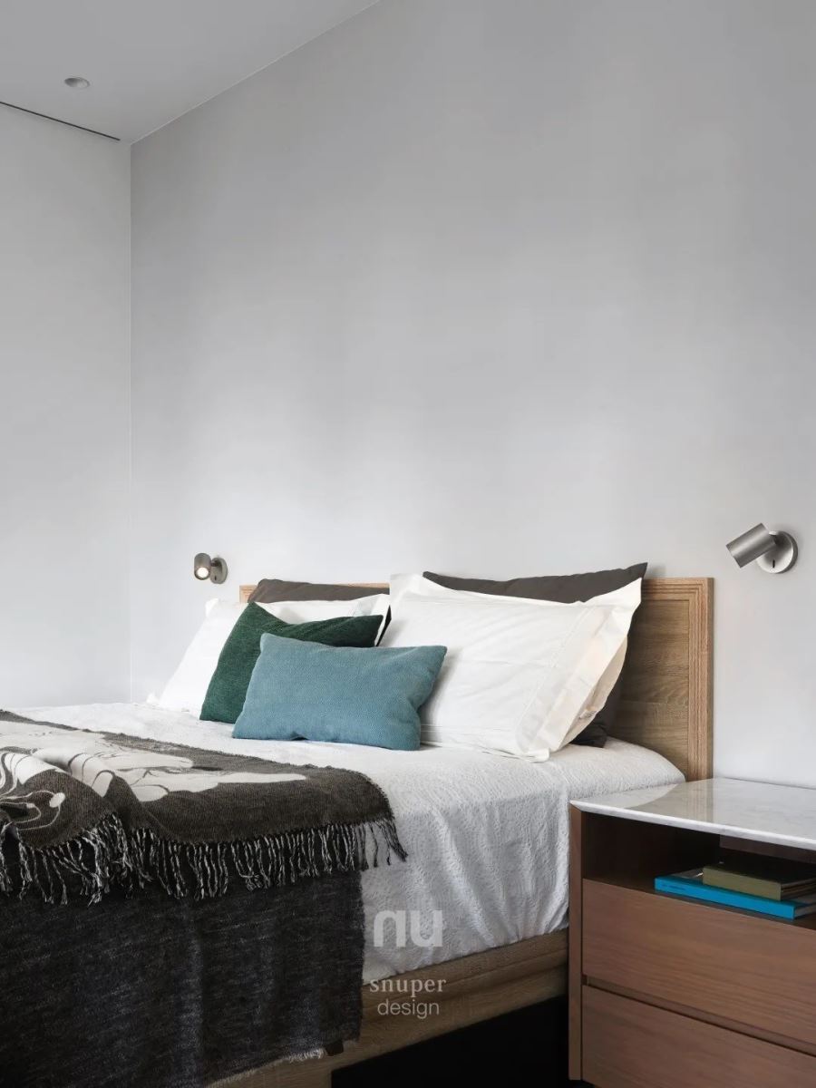 赋予多元、弹性的使用方式,在扩张空间尺度之外,为居住者的生活提供充满真情实感的空间。 淡雅的色调占据了卧室的主体,沿床边设有硕大的卡座,这是一种生活方式的诱导和改善,亮一盏灯,带本想阅读的书,掀起窗帘满眼的风景,珍贵的不一定是材质,更是宁静与舒缓的生活营造。