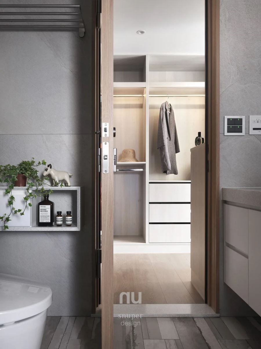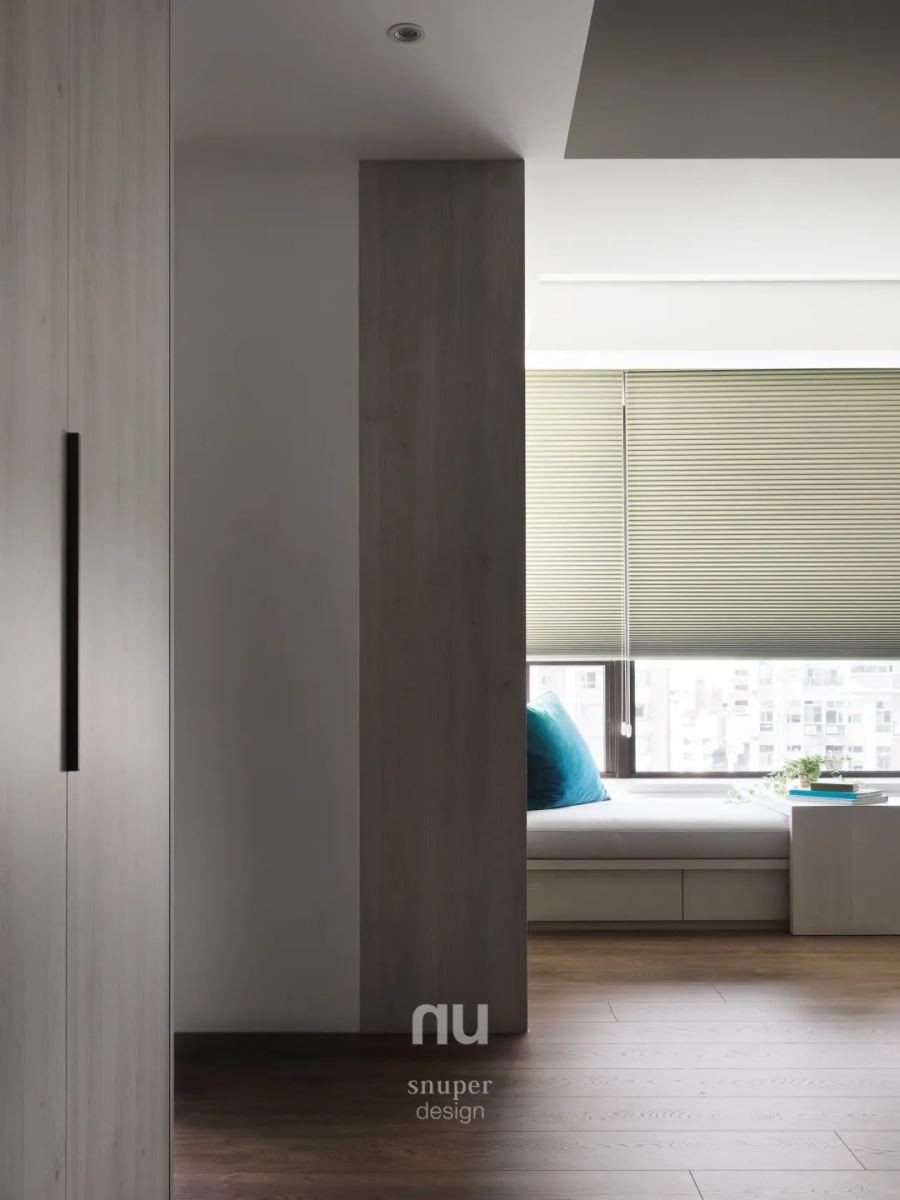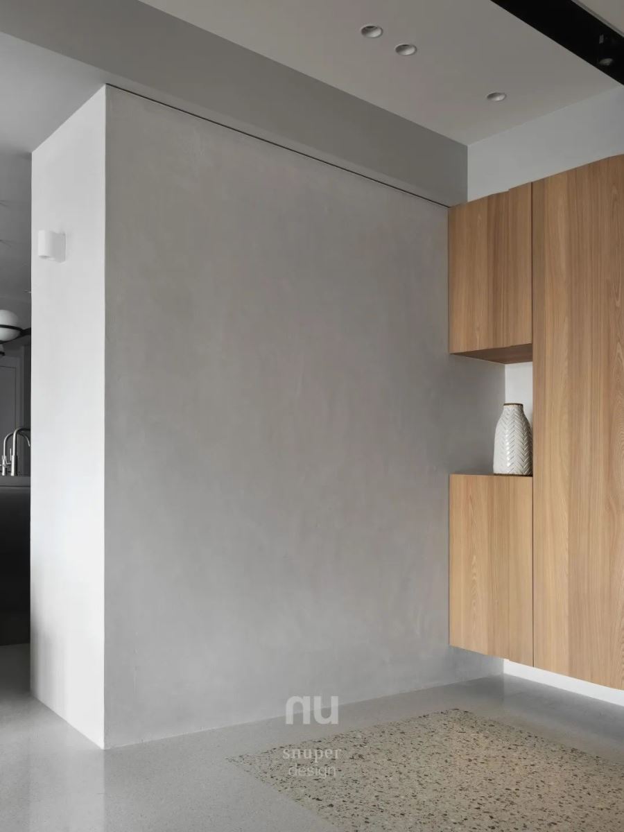 柔和的自然光是最无价的建材,柔和映照在墙面上,每时每刻让家景均有着出彩多元的画面。 从玄关进入,立面使用自然感丰沛的木皮、灰色特殊漆,纯粹不复杂的建材让人感受到宁静温馨、岁月美好。地面材料使用质朴无华的水磨石,一直延伸至隔断后方的厨房区域。