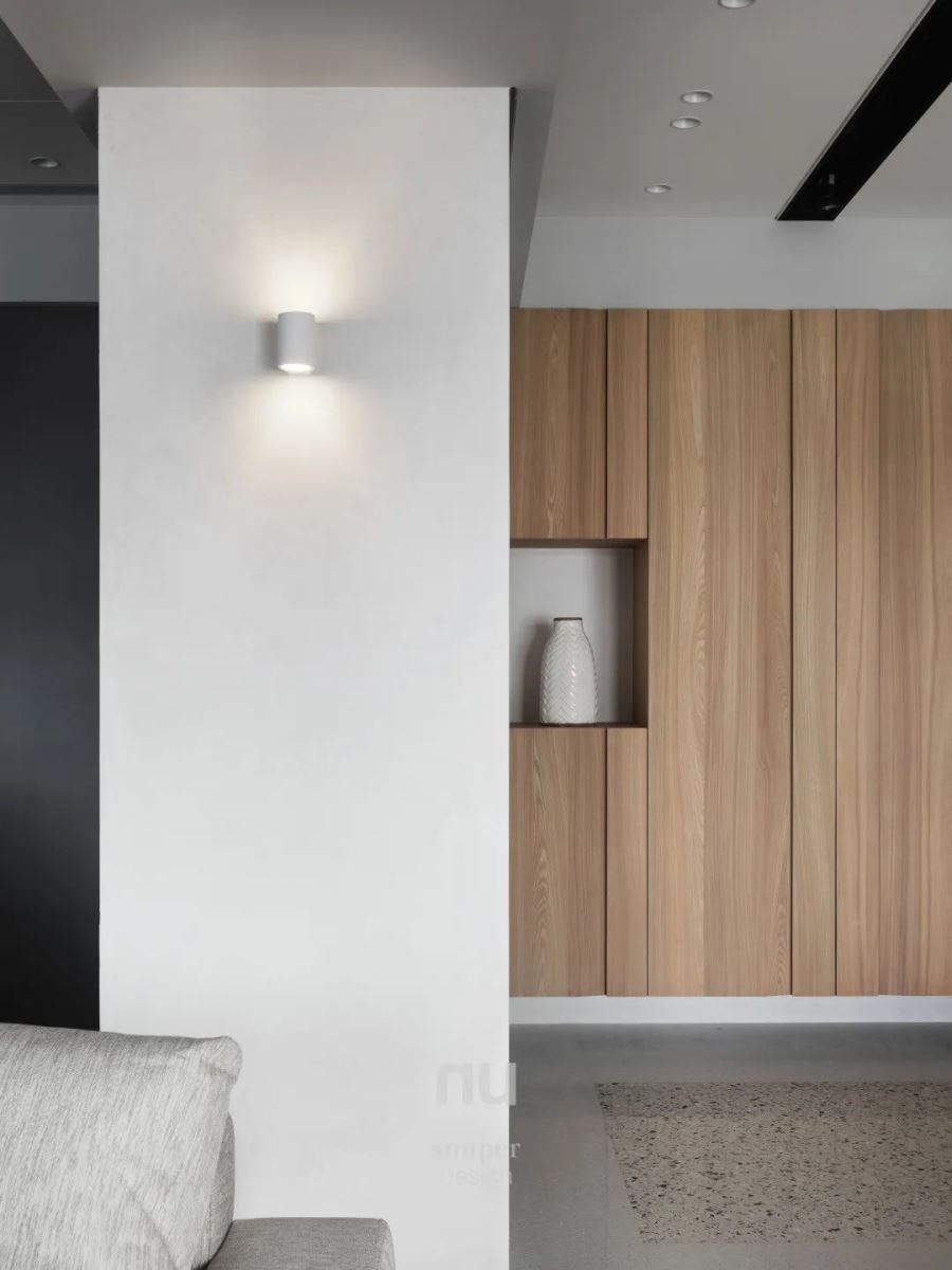 不作过多的天花板造型包覆,适当的修饰建筑本身的梁体后,将高度推到最顶,尽可能留有最宽裕的生活空间,并简洁的设置上简单的轨道灯,看似不费力的画面,却将细节臻至完美极致。